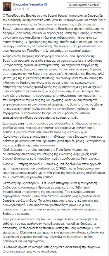 Επίθεση στην Πρόεδρο της Βουλής, Ζωή Κωνσταντοπούλου, εξαπέλυσε ο Ευάγγελος Βενιζέλος, με ανάρτηση που έκανε στον προσωπικό του λογαριασμό στο Facebook, κατηγορώντας παράλληλα, τον Πρωθυπουργό, Αλέξη Τσίπρα, για αδράνεια, αλλά και για επιπόλαιη επιλογή σε ότι αφορά την κυρία Κωνσταντοπούλου. Αναλυτικά η ανακοίνωση του πρώην Προέδρου του ΠΑΣΟΚ: