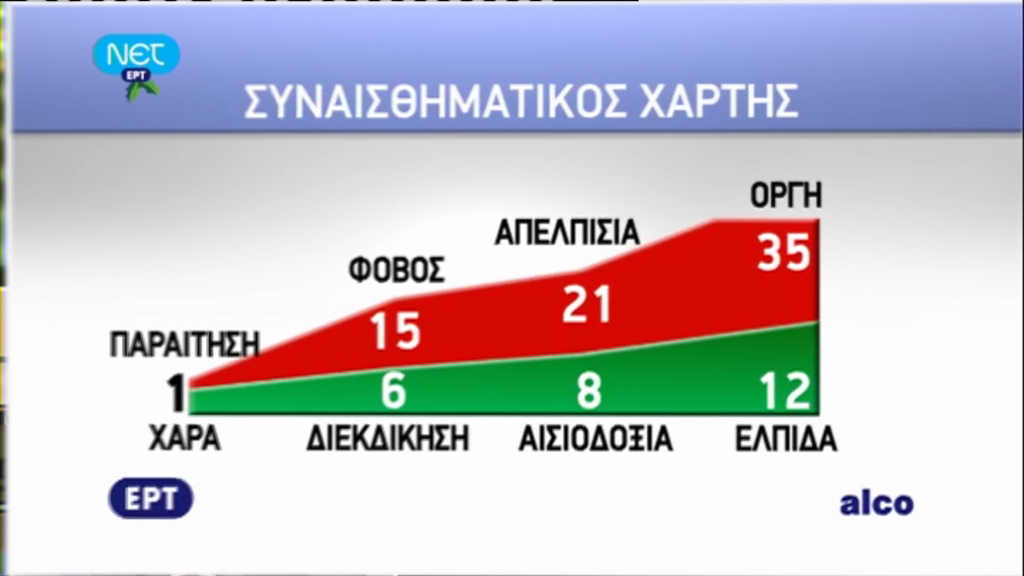 Επίσης, τα συναισθήματα των ερωτηθέντων είναι κατά βάση αρνητικά, όμως για πρώτη φορά υπάρχει τάση για θετικά συναισθήματα.
