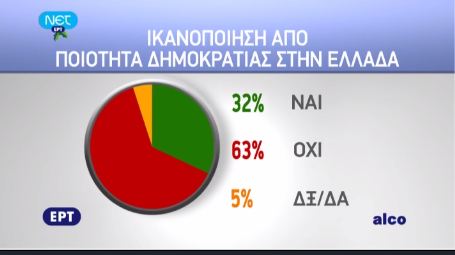 Κλίμα διάχυτης απογοήτευσης και απαισιοδοξίας καταγράφεται στην έρευνα της ALCO για την ΝΕΤ. Είναι χαρακτηριστικό ότι το 71% των ερωτηθέντων πιστεύει ότι η Ελλάδα κινείται σε λάθος κατεύθυνση και μόλις το 18% σε σωστή, ενώ το 63% δεν είναι ικανοποιημένο από την ποιότητα της δημοκρατίας στη χώρα.