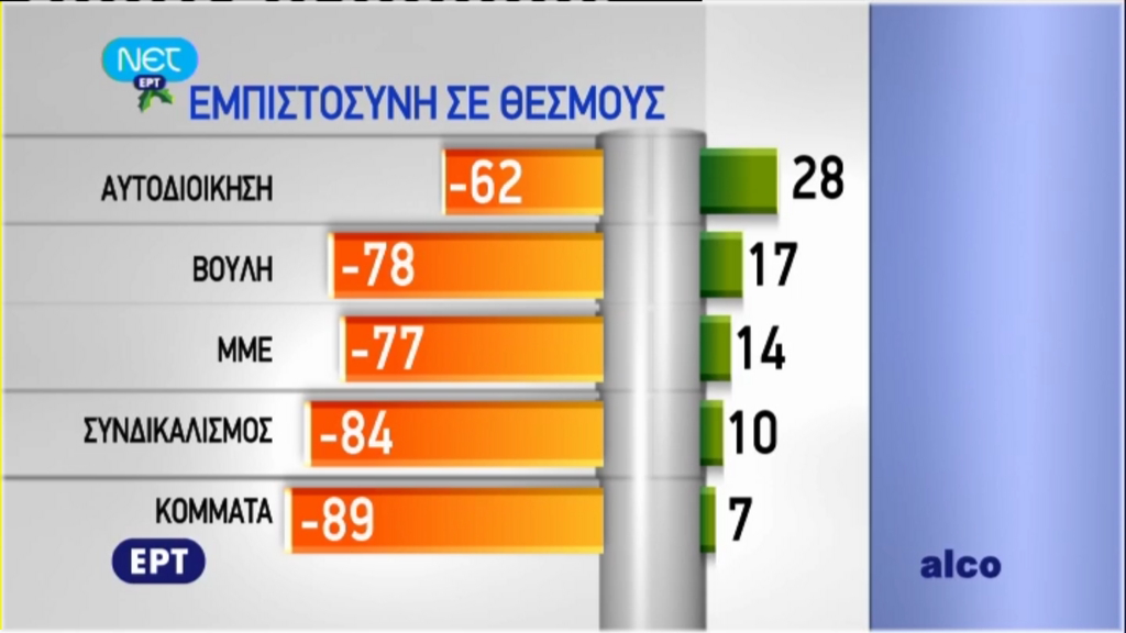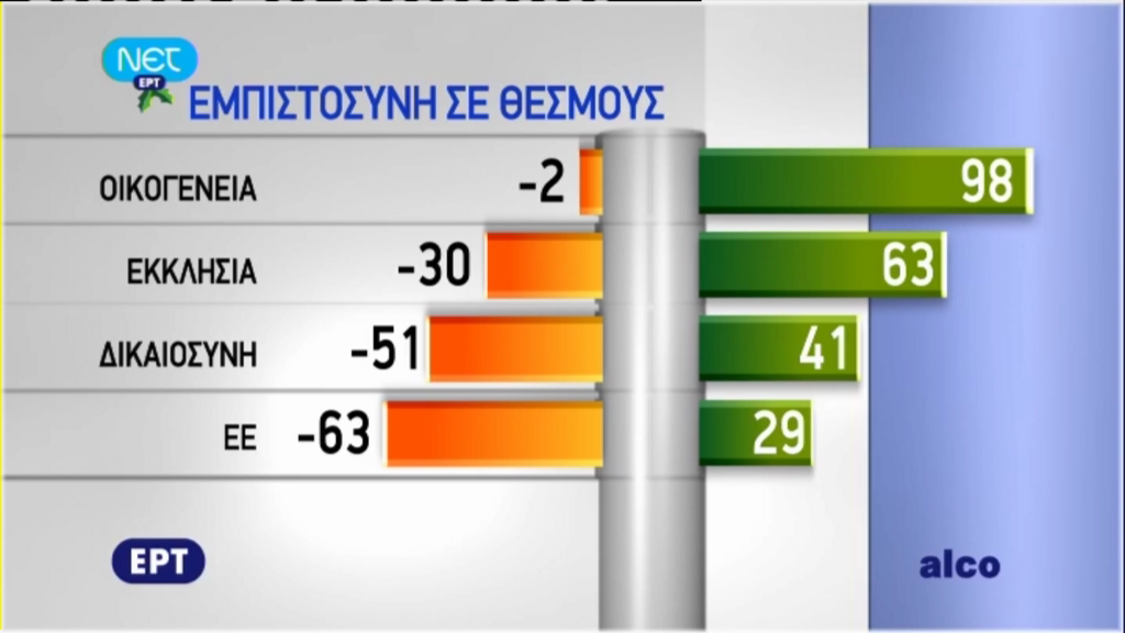 Τέλος, στο “βαρόμετρο” σε σχέση με τους θεσμούς υπάρχει μία καθολική εμπιστοσύνη στο θεσμό της οικογένειας, ενώ θετικό πρόσημο εμφανίζει και η εκκλησία.