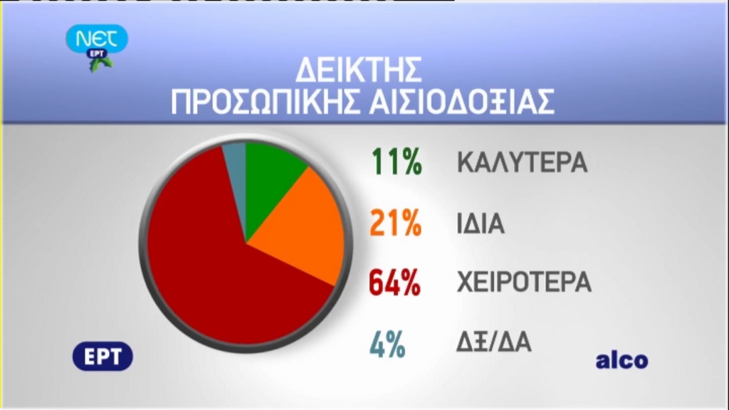 Σε ότι αφορά τον δείκτη αισιοδοξίας, το 68% των ερωτηθέντων εκτιμά ότι πράγματα θα χειροτερέψουν. Το ίδιο ισχύει και για τον δείκτη προσωπικής αισιοδοξίας, καθώς μόλις το 16% των ερωτηθέντων πιστεύει ότι θα πάνε τα πράγματα καλύτερα για τους ίδιους.