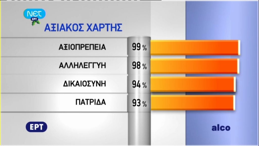 Η αξιοπρέπεια και η αλληλεγγύη θεωρήθηκαν από τους πολίτες οι κυρίαρχες αξίες, ενώ ακολουθεί, η δικαιοσύνη και η πατρίδα.