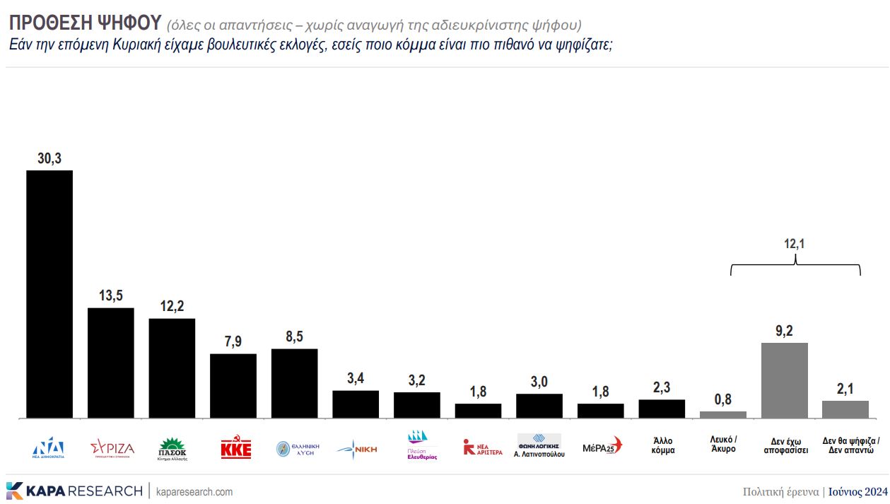 Στην πρόθεση ψήφου, η ΝΔ φαίνεται ότι ξεπερνά τον πήχυ του 30%, ενώ αντιθέτως ο ΣΥΡΙΖΑ βρίσκεται κάτω από το 15% (13,5%) με το ΠΑΣΟΚ να τον πλησιάζει στη μία μονάδα περίπου (12,2%), χωρίς όμως να ενισχύει τις δυνάμεις του. Τα υπόλοιπα κόμματα, με μικρές αυξομειώσεις κρατούν τις δυνάμεις που κατέγραψαν στις ευρωεκλογές