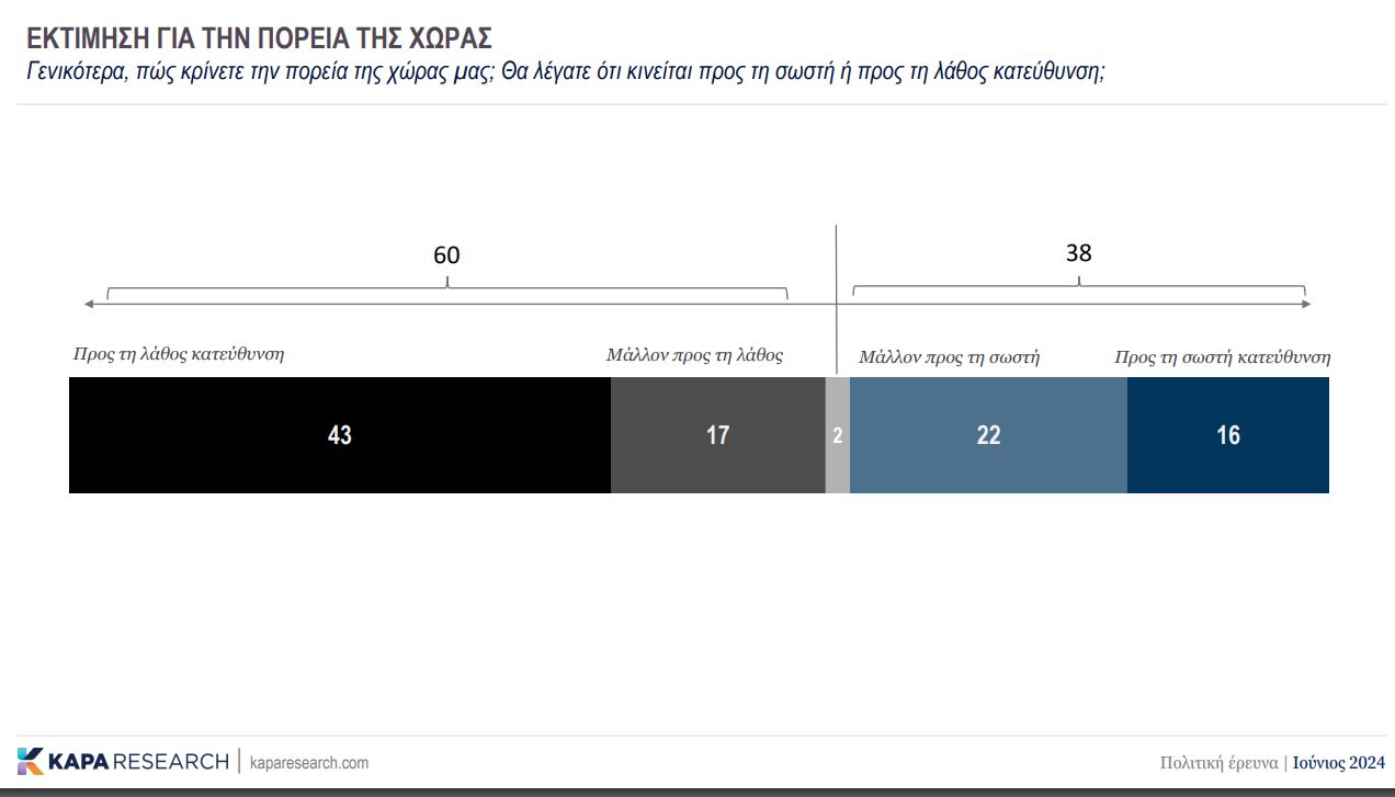 Στο ερώτημα αν η χώρα κινείται σε σωστή ή λάθος κατεύθυνση, το 38% απαντά θετικά και το 60% αρνητικά, κάτι που σημαίνει ότι ο πήχης για την κυβέρνηση στα τρία χρόνια που ακολουθούν είναι πολύ ψηλότερα από ποτέ.