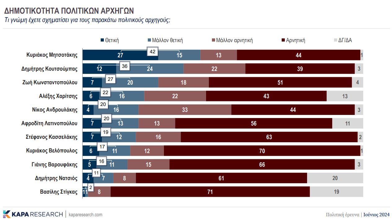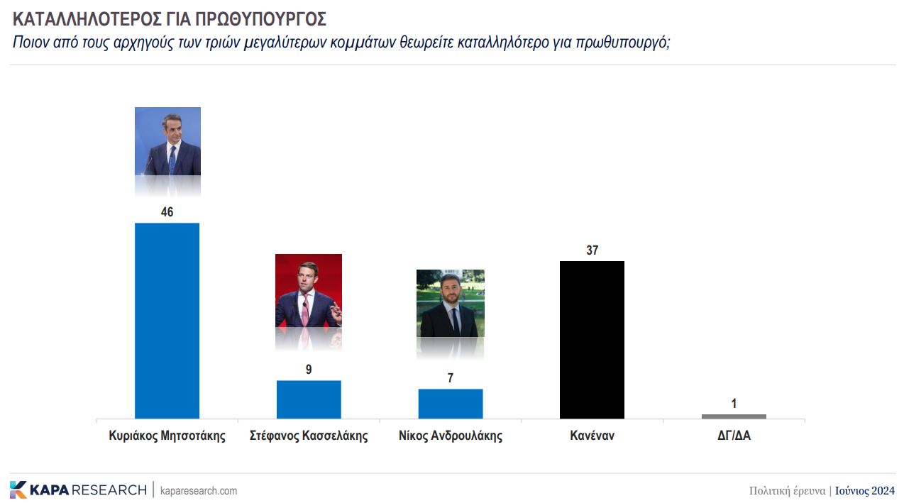 Παράλληλα, στο ερώτημα για το ποιος είναι καταλληλότερος για πρωθυπουργός, ο Κυριάκος Μητσοτάκης είναι μπροστά με 46%, πάνω και από τον «κανέναν» (37%) και διατηρώντας μεγάλη διαφορά από τον Στ. Κασσελάκη (9%) και Ν. Ανδρουλάκη (7%). Μεγάλη η διαφορά υπέρ του πρωθυπουργού στο δείκτη της δημοτικότητας πολιτικών αρχηγών με 42%, με τον Στ. Κασσελάκη να βρίσκεται στην έβδομη θέση με 19%, πίσω και από την Αφρ. Λατινοπούλου (20%).