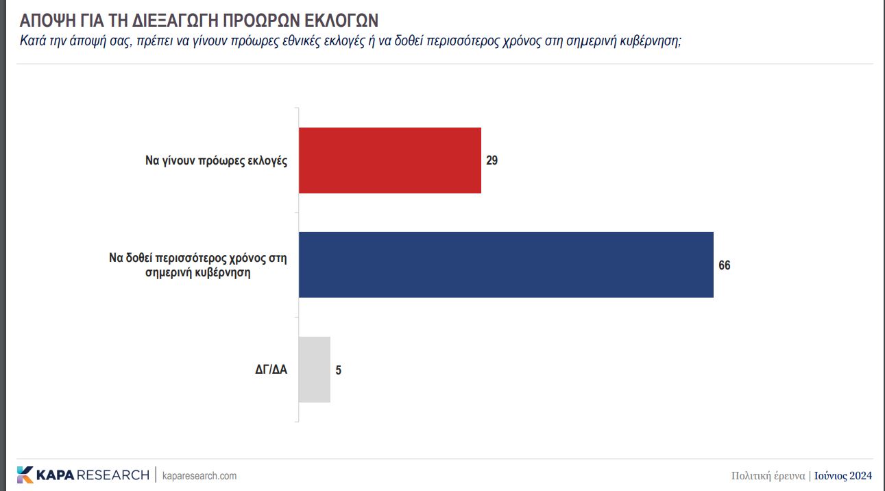Οχι στα σενάρια των πρόωρων εκλογών, ναι στην ολοκλήρωση της θητείας της κυβέρνησης, με εστίαση όμως στα θέματα κόστους διαβίωσης, υγείας και ασφάλειας του πολίτη. Αυτά είναι τα συμπεράσματα της έρευνας της Kapa Research, για το πώς διαμορφώνεται το πολιτικό τοπίο μετά τις ευρωεκλογές.