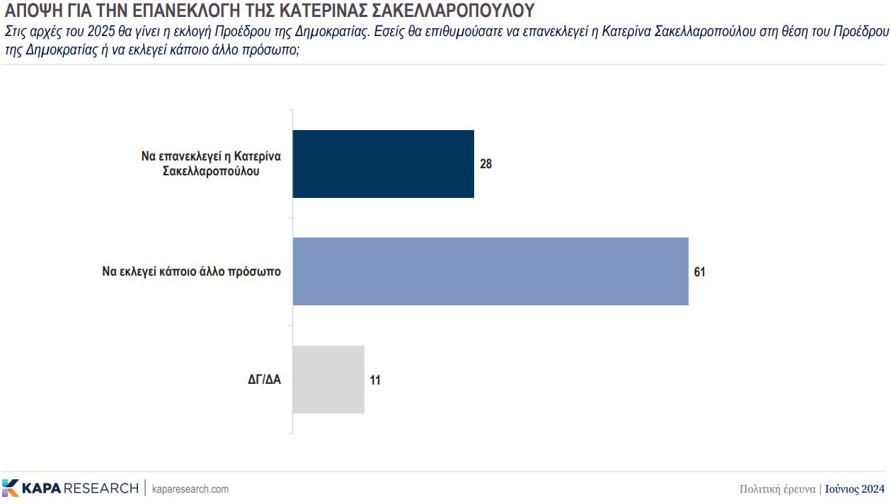 Ενδιαφέρον παρουσιάζουν και οι απαντήσεις για την Πρόεδρο της Δημοκρατίας, αφού για πρώτη φορά η πλειοψηφία (61%) ζητά να εκλεγεί άλλο πρόσωπο, ενώ μόνο το 28% υποστηρίζει την επανεκλογή της Κατερίνας Σακελλαροπούλου. Όσο για τη δημοφιλία του πρωθυπουργού επανέρχεται στα υψηλά, προεκλογικά ποσοστά.