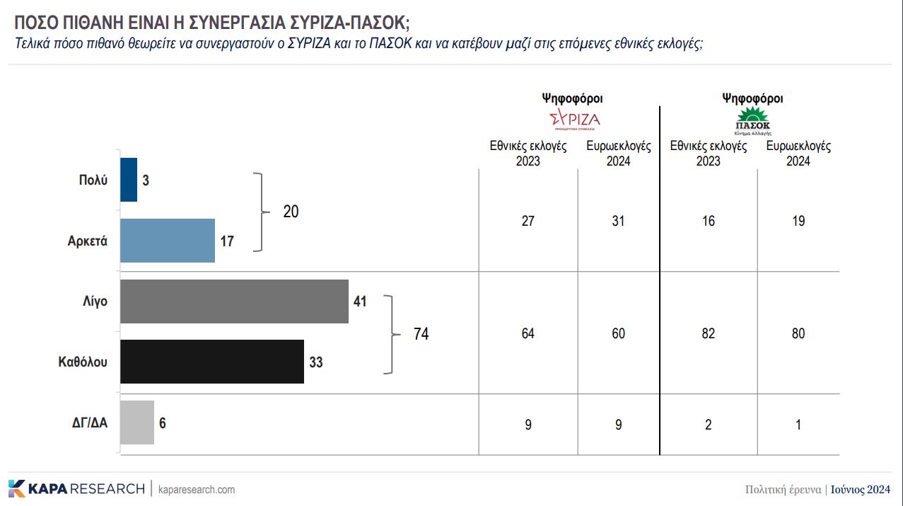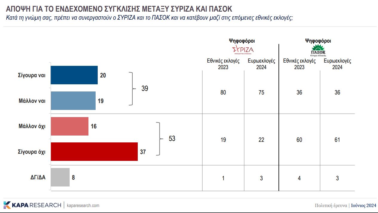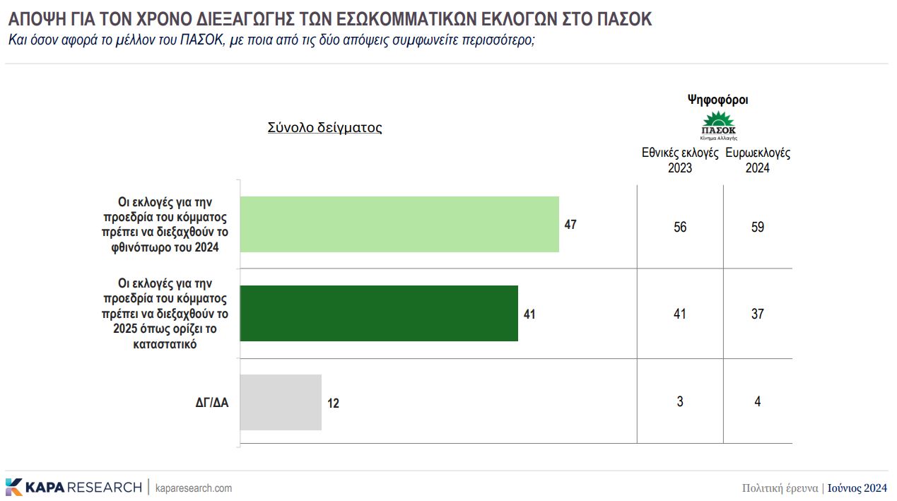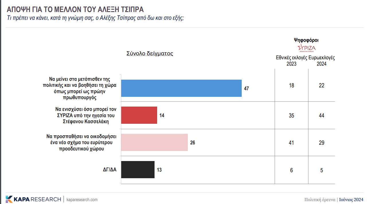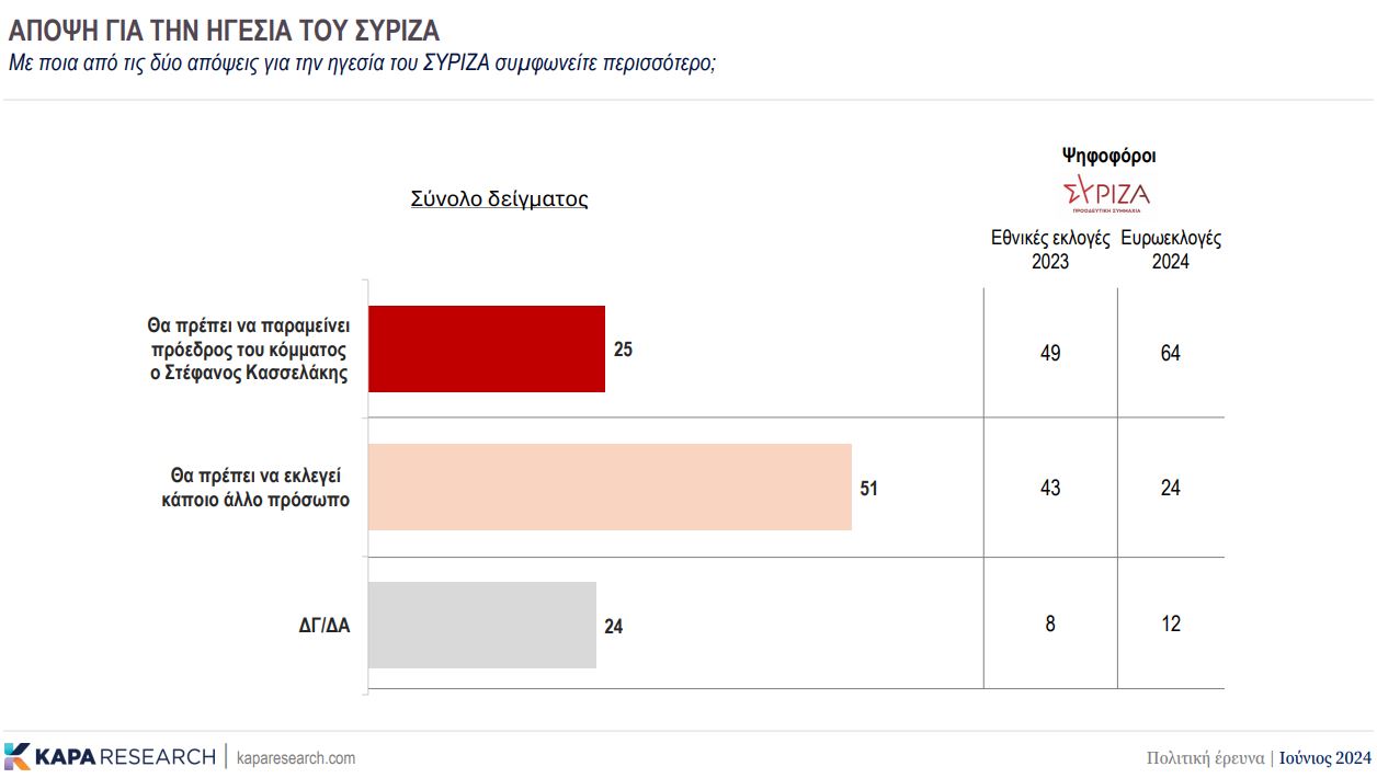 Ειδικά για το κόμμα της αξιωματικής αντιπολίτευσης η κρίση δείχνει να γενικεύεται, αγγίζοντας ακόμα και τον πρόεδρο του κόμματος. Συγκεκριμένα, μόλις ο ένας στους τέσσερις εκτιμά πλέον ότι πρέπει να παραμείνει πρόεδρος το Στέφανος Κασσελάκης ενώ ο ένας στους δύο (51%) ζητά να εκλεγεί άλλο πρόσωπο. Αλλά και το rebranding του Αλέξη Τσίπρα δεν φαίνεται να έχει την απόδοση που ίσως προσδοκά ο πρώην πρωθυπουργός, καθώς το 47% εκτιμά πως ο Αλέξης Τσίπρας καλό είναι να μείνει στα μετόπισθεν και να βοηθήσει τη χώρα όπως μπορεί ως πρώην πρωθυπουργός. Σε ό,τι αφορά στο ΠΑΣΟΚ, διχασμός επικρατεί ως προς το πότε θα πρέπει να γίνουν εσωκομματικές εκλογές-το φθινόπωρο του 2024 ή το 2025, όπως ορίζει το καταστατικό.