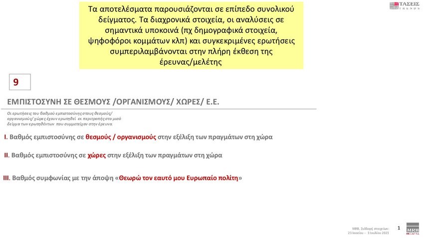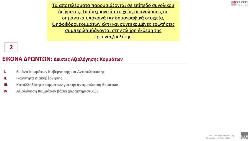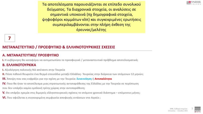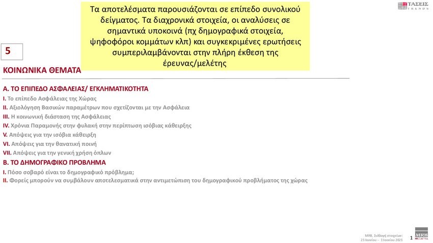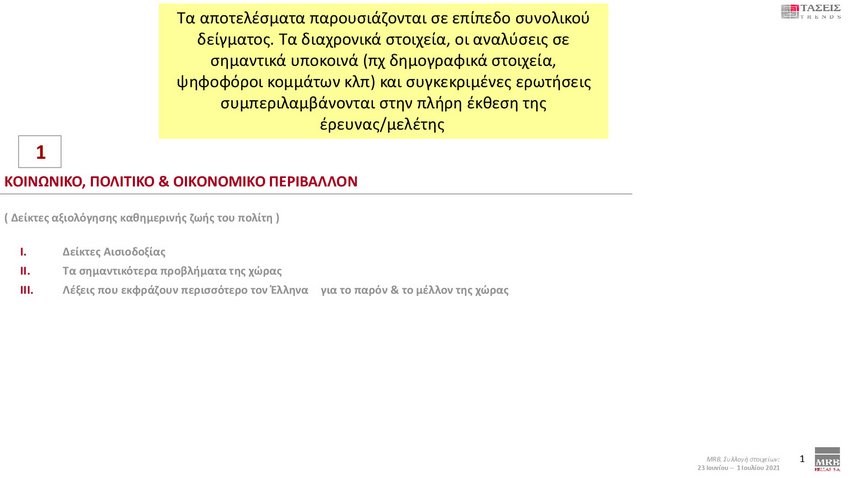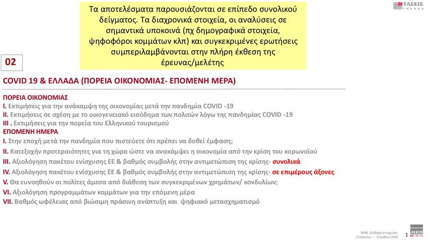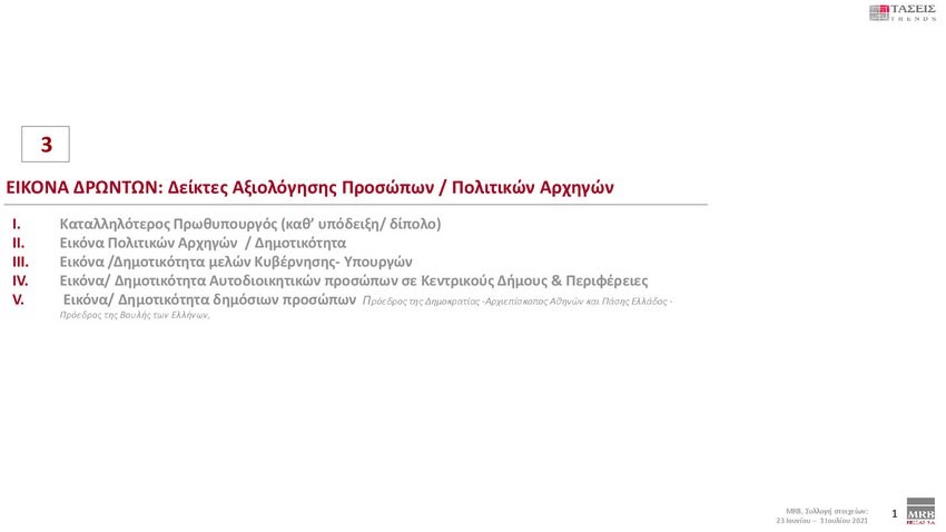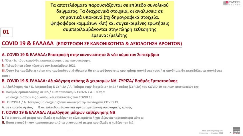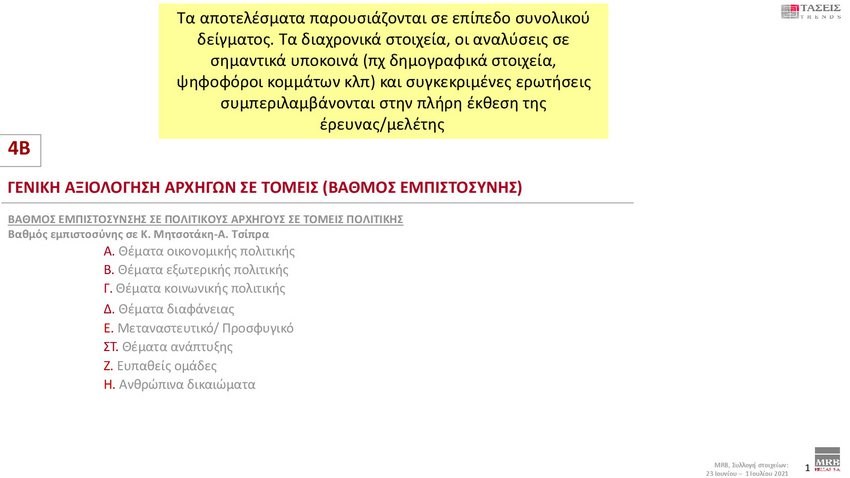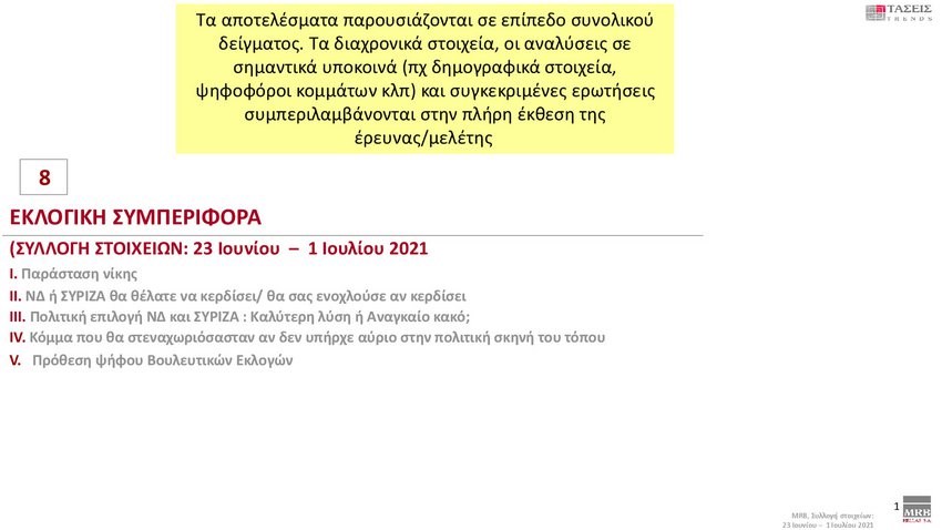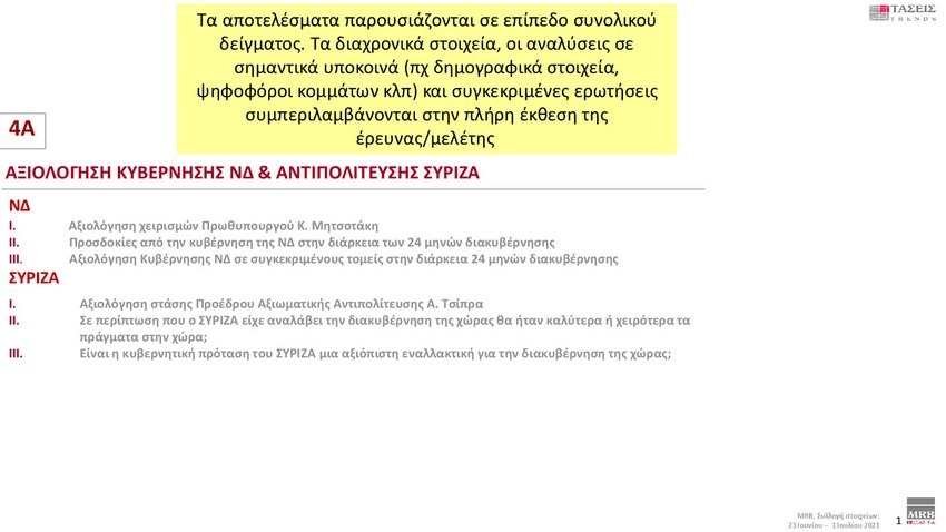 Εξαιρετικό ενδιαφέρον παρουσιάζουν οι τάσεις της MRB που καταγράφουν τη σημερινή πολιτική κατάσταση της χώρας (Xρόνος διεξαγωγής 23 Ιουνίου – 1 Ιουλίου 2021). Στην πρόθεση ψήφου και στα στοιχεία που καταγράφηκαν στις τάσεις της MRB, η ΝΔ προηγείται με διαφορά 12,9 % έναντι του ΣΥΡΙΖΑ.