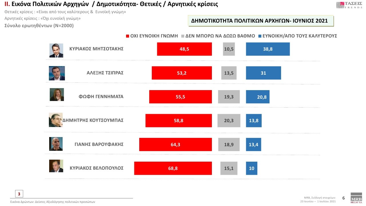 Στον πίνακα που ακολουθεί δείτε πώς διαμορφώνεται στις τάσεις Ιουλίου 2021 της MRB η δημοτικότητα των πολιτικών αρχηγών.