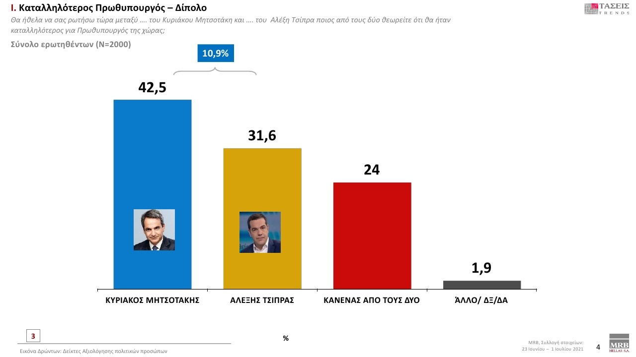 Συγκεκριμένα, ο πρωθυπουργός και πρόεδρος της ΝΔ συγκεντρώνει το 42,5 % των ερωτηθέντων και ο πρόεδρος του ΣΥΡΙΖΑ και επικεφαλής της αξιωματικής αντιπολίτευσης το 31,6 %. «Κανένας από τους δύο» απαντά το 24 %.