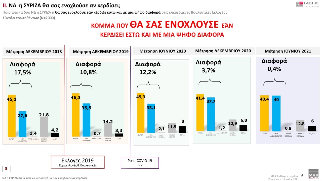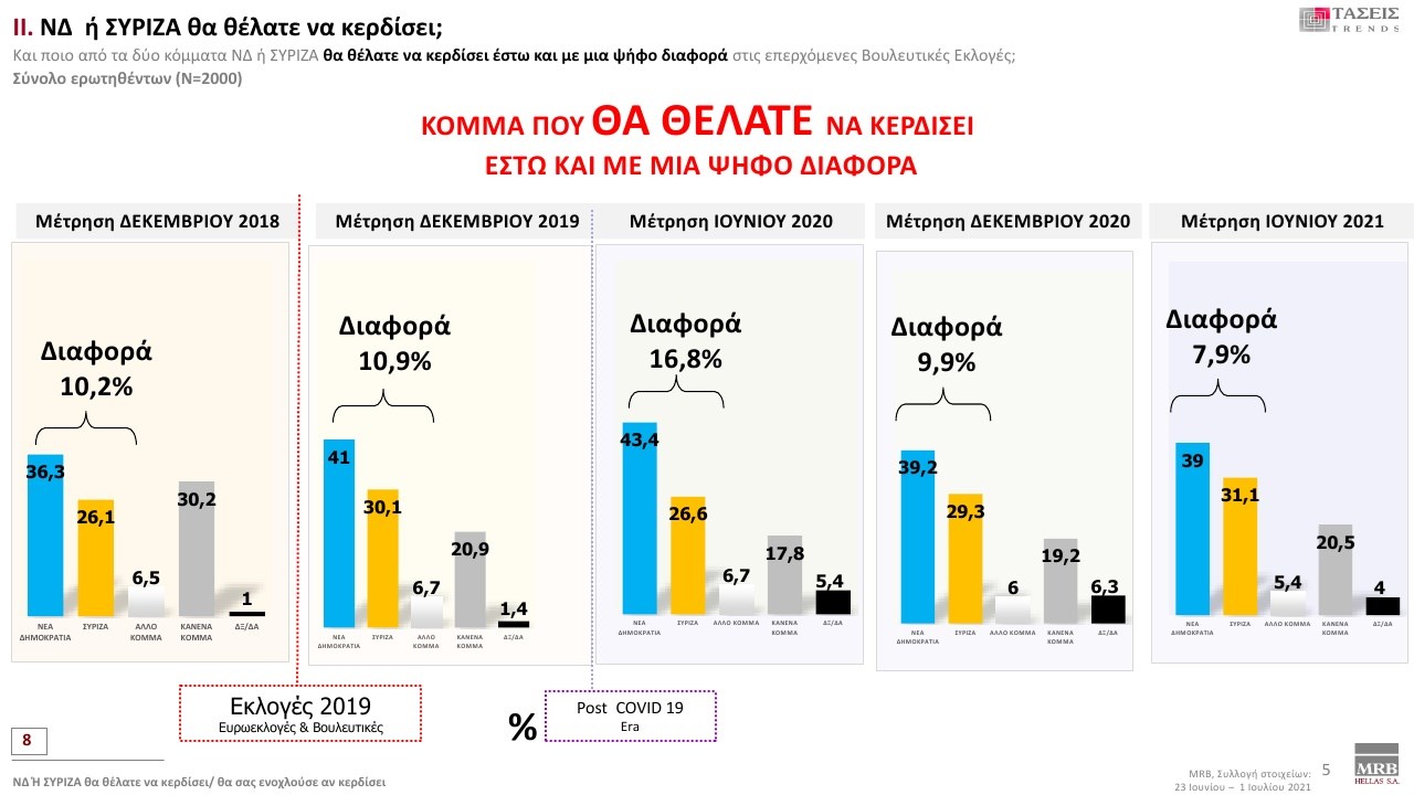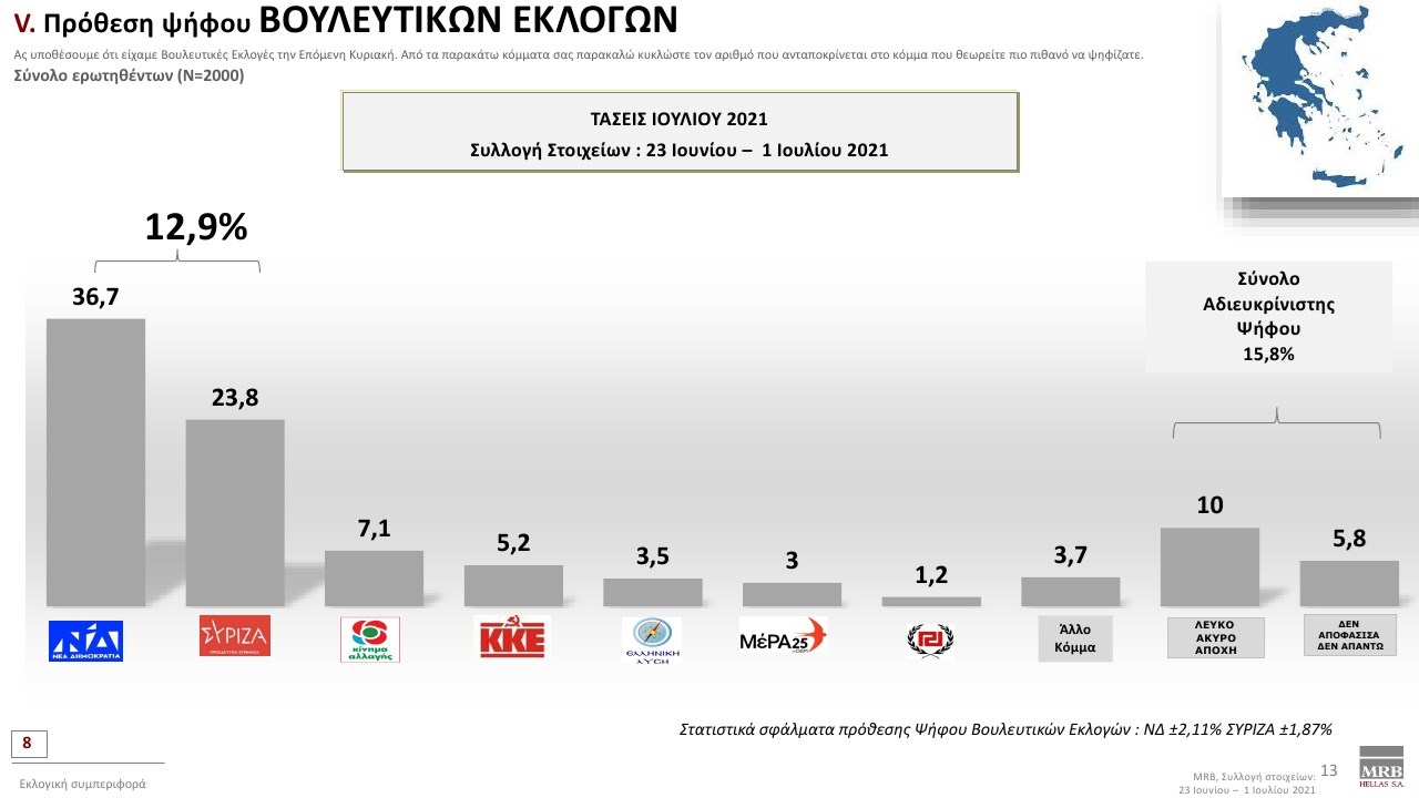 Εξαιρετικό ενδιαφέρον παρουσιάζουν οι τάσεις της MRB που καταγράφουν τη σημερινή πολιτική κατάσταση της χώρας (Xρόνος διεξαγωγής 23 Ιουνίου – 1 Ιουλίου 2021). Στην πρόθεση ψήφου και στα στοιχεία που καταγράφηκαν στις τάσεις της MRB, η ΝΔ προηγείται με διαφορά 12,9 % έναντι του ΣΥΡΙΖΑ.