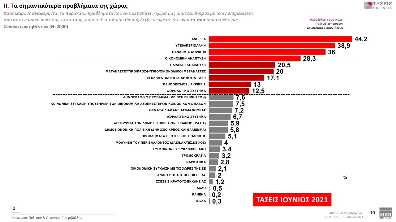 Οι πολίτες θεωρούν ότι τα 4 σημαντικότερα προβλήματα της χώρας είναι: Aνεργία με 44,2 %, Υγεία/Περίθαλψη με 38,9 %, Πανδημία COVID19 με 36 %, Οικονομική Ανάπτυξη με 28,3 %.