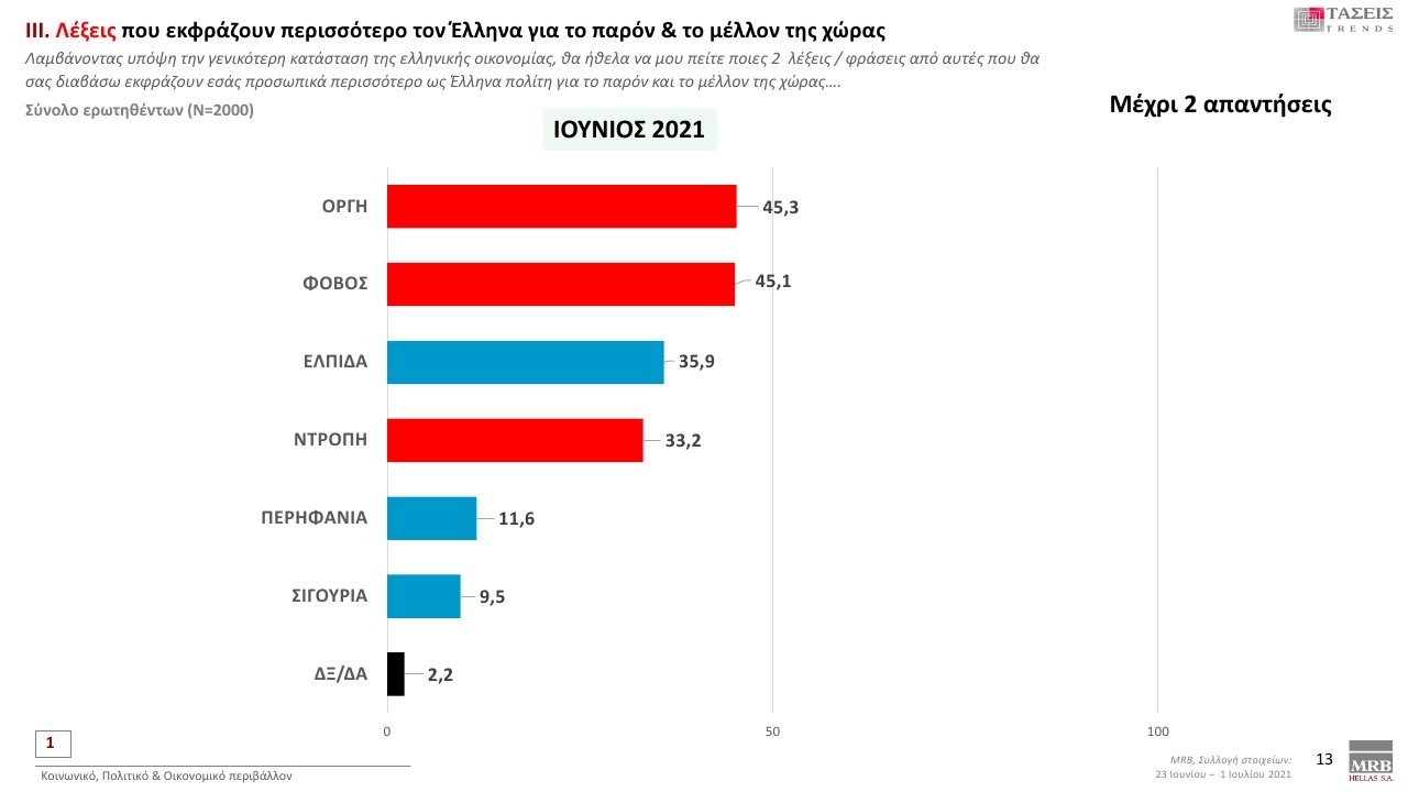 Η λέξη «Οργή» σε ποσοστό 45,3 % εκφράζει περισσότερο τους πολίτες για το παρόν και το μέλλον της χώρας, ακολουθούν ο «Φόβος» με ποσοστό 45,1 %, η «Ελπίδα» με 35,9 % και η «Ντροπή» με 33,2 %.