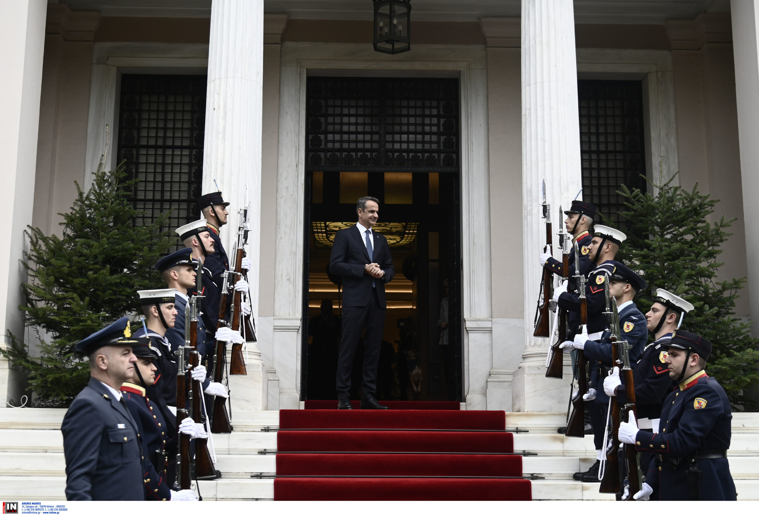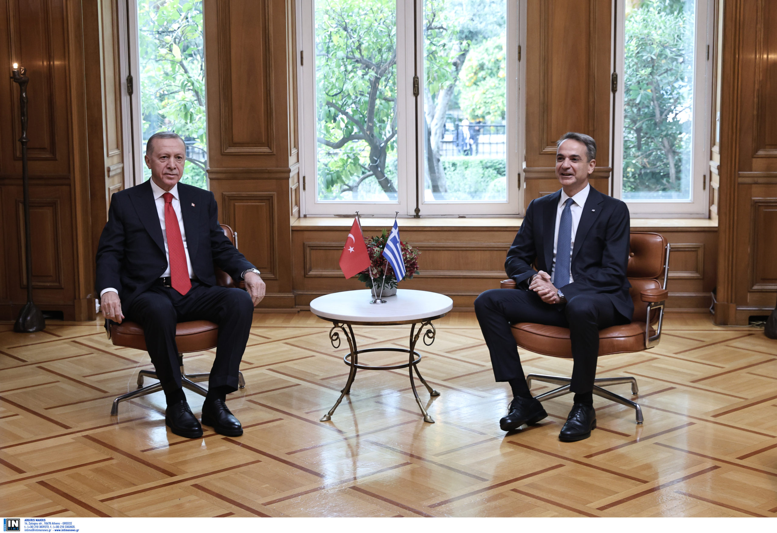 Τον Τούρκο Πρόεδρο υποδέχτηκε στο Μέγαρο Μαξίμου ο Κυριάκος Μητσοτάκης. Οι δύο άνδρες είχαν θερμή χειραψία και μια σύντομη συνομιλία. Μετά την καθιερωμένη φωτογραφία στο κατώφλι του Μεγάρου Μαξίμου προχώρησαν στο εσωτερικό, όπου το τετ-α-τετ τους διήρκησε περισσότερο από το προγραμματισμένο.