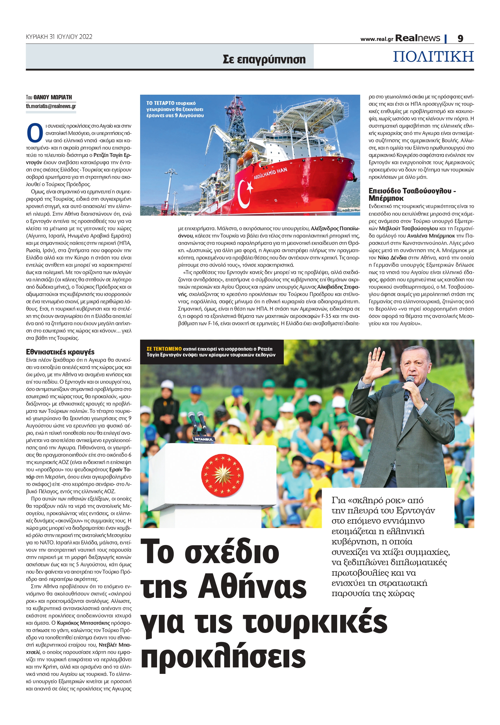 Ο Ερντογάν και οι υπουργοί του, όσο αντιμετωπίζουν σημαντικά προβλήματα στο εσωτερικό της χώρας τους, θα προκαλούν, «μουδιάζοντας» με εθνικιστικές κραυγές τα προβλήματα των Τούρκων πολιτών. Το τέταρτο τουρκικό γεωτρύπανο θα ξεκινήσει γεωτρήσεις στις 9 Αυγούστου ώστε να ερευνήσει για φυσικό αέριο, ενώ η τελική τοποθεσία που θα επιλεγεί αναμένεται να αποτελέσει αντικείμενο εργαλειοποίησης από την Άγκυρα.