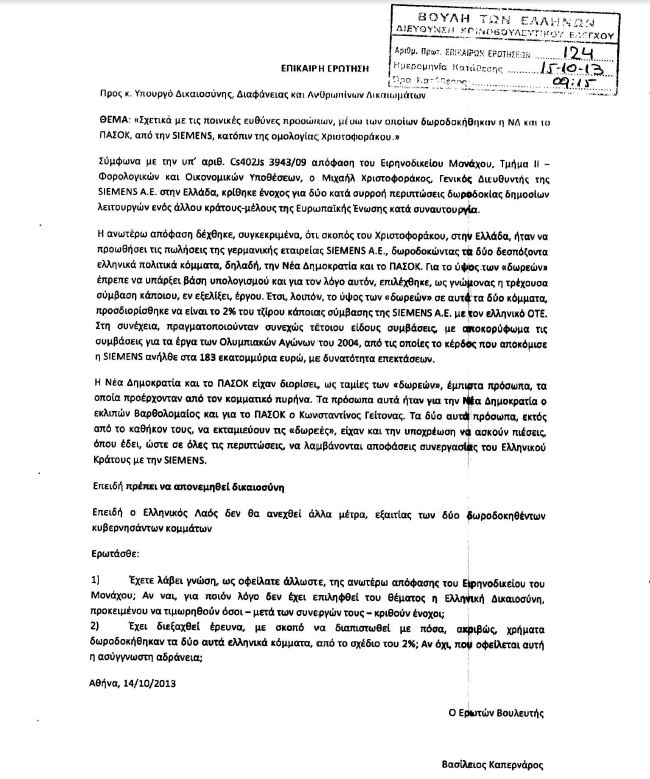 Επίκαιρη ερώτηση προς τον υπουργό Δικαιοσύνης “σχετικά με τις ποινικές ευθύνες προσώπων μέσω των οποίων δωροδοκήθηκαν η ΝΔ και το ΠΑΣΟΚ από την SIEMENS, κατόπιν της ομολογίας Χριστοφοράκου” κατέθεσε ο κοινοβουλευτικός εκπρόσωπος των Ανεξάρτητων Ελλήνων Βασίλης Καπερνάρος.