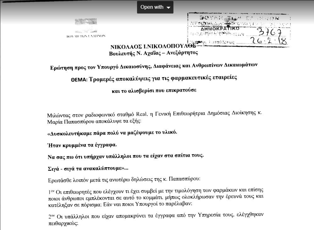 Ο ανεξάρτητος βουλευτής Αχαίας, Νίκος Νικολόπουλος, με αφορμή αποκαλυπτικό δημοσίευμα της Realnews, κατέθεσε ερώτηση στον υπουργό Δικαιοσύνης, Σταύρο Κοντονή, όπως συγκεκριμένα αναφέρει για τις «τρομερές αποκαλύψεις για φαρμακευτικές εταιρίες και το αλισβερίσι που επικρατούσε».