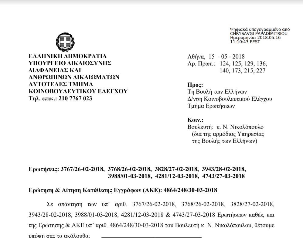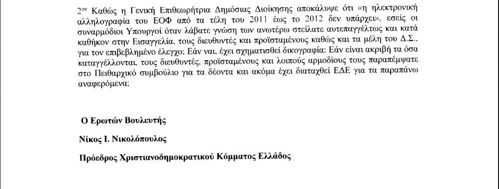 Στην ερώτηση επισυνάπτει και τις σχετικές δηλώσεις της Γενικής Επιθεωρήτριας Δημόσιας Διοίκησης Μαρίας Παπασπύρου
