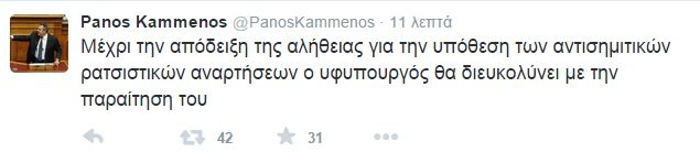 Προηγήθηκε το tweet του Πάνου Καμμένου, με το οποίο παραίτησε τον βουλευτή των Ανεξαρτήτων Ελλήνων.