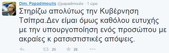 Επίσης ο ευρωβουλευτής του ΣΥΡΙΖΑ, Δημήτρης Παπαδημούλης, με σχόλιό του στο twitter άφησε σαφή υπονοούμενα για την υπουργοποίηση του κ. Καμμένου.