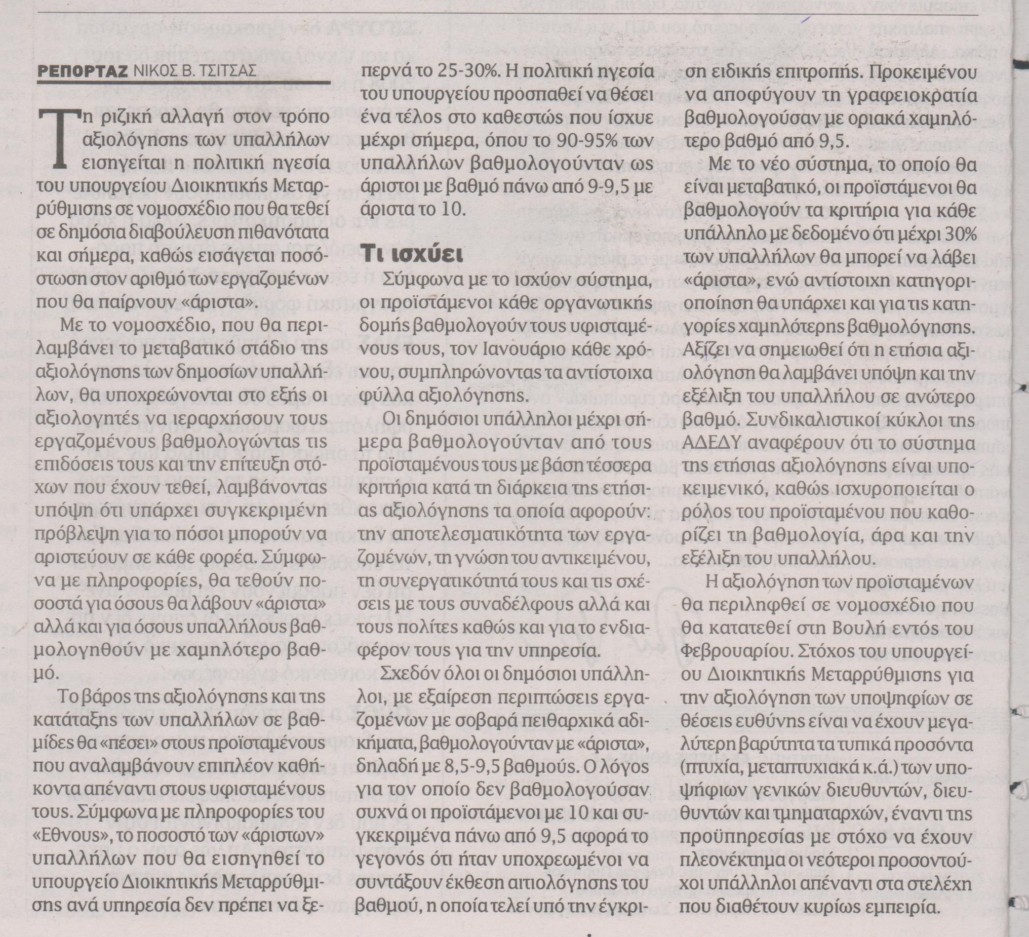 Σύμφωνα με πληροφορίες, θα τεθούν ποσοστά για όσους λάβουν «άριστα» αλλά και για όσους υπαλλήλους βαθμολογηθούν με χαμηλότερο βαθμό.