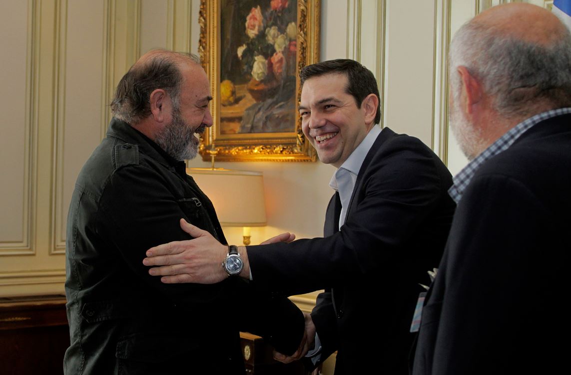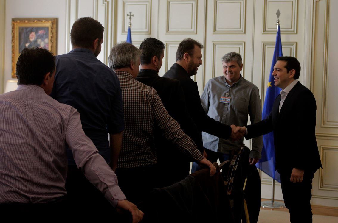 Σε εξέλιξη βρίσκεται αυτή την ώρα η συνάντηση του Πρωθυπουργού Αλέξη Τσίπρα με το συντονιστικό των αγροτών, στο Μέγαρο Μαξίμου. Όπως φαίνεται και στις φωτογραφίες ο Πρωθυπουργός υποδέχθηκε με χαμόγελο τους αγρότες και αντάλλαξε μαζί τους χειραψία.