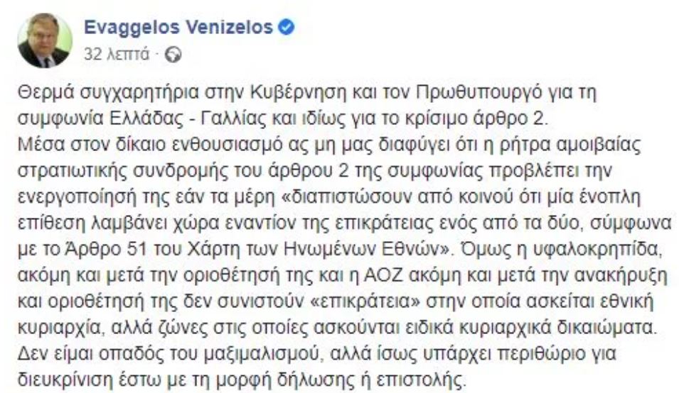 Ο πρώην πρόεδρος του ΠΑΣΟΚ και αντιπρόεδρος της κυβέρνησης, Ευάγγελος Βενιζέλος με ανάρτησή του στο facebook σχολιάζει την αμυντική συμφωνία Ελλάδας – Γαλλίας και αναφέρει: «Θερμά συγχαρητήρια στην Κυβέρνηση και τον Πρωθυπουργό για τη συμφωνία Ελλάδας – Γαλλίας και ιδίως για το κρίσιμο άρθρο 2.»