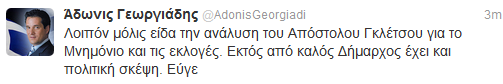 Ο υποψήφιος βουλευτής της ΝΔ, Άδωνις Γεωργιάδης “χαιρέτισε” μέσω Twitter, τις πολιτικές σκέψεις του δημάρχου Στυλίδας, Απόστολου Γκλέτσου.”Λοιπόν μόλις είδα την ανάλυση του Απόστολου Γκλέτσου για το Μνημόνιο και τις εκλογές. Εκτός από καλός Δήμαρχος έχει και πολιτική σκέψη. Εύγε”.