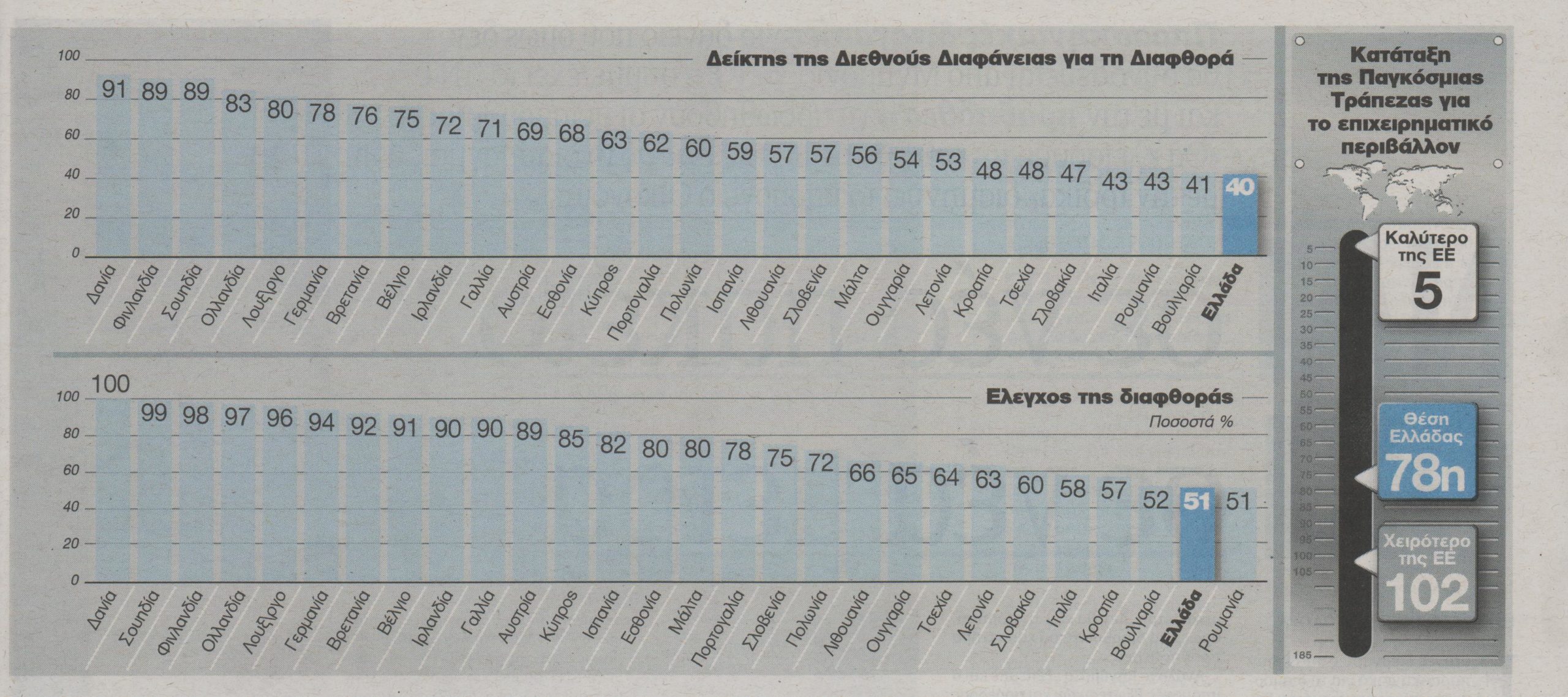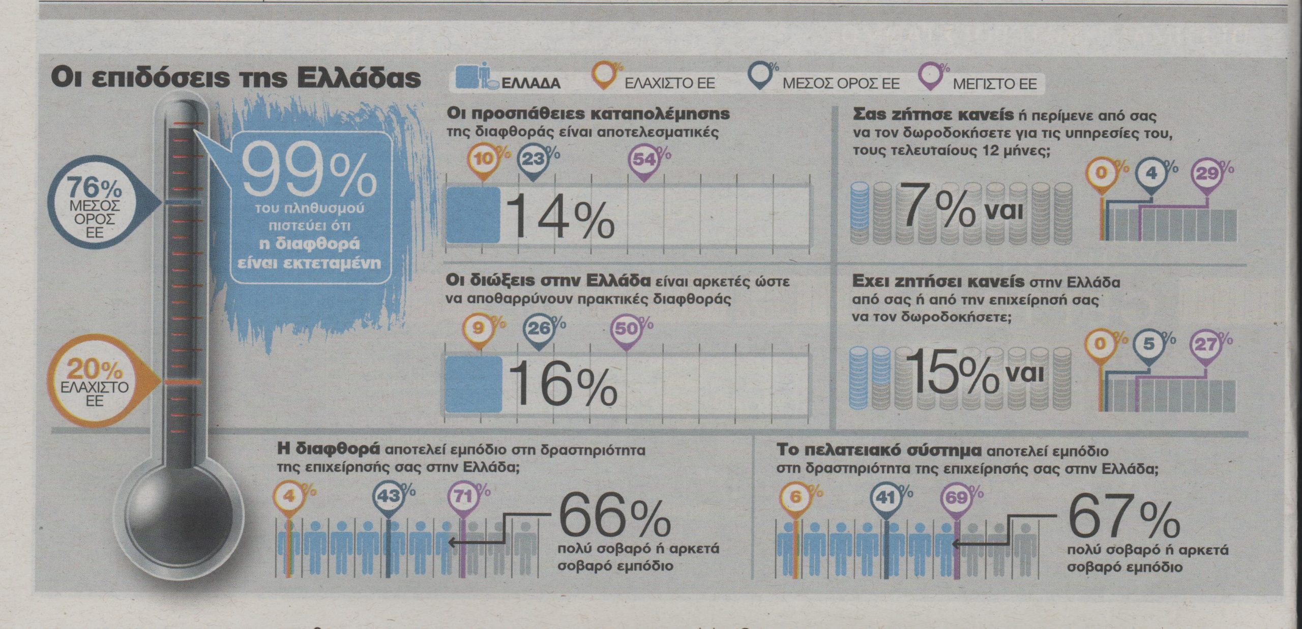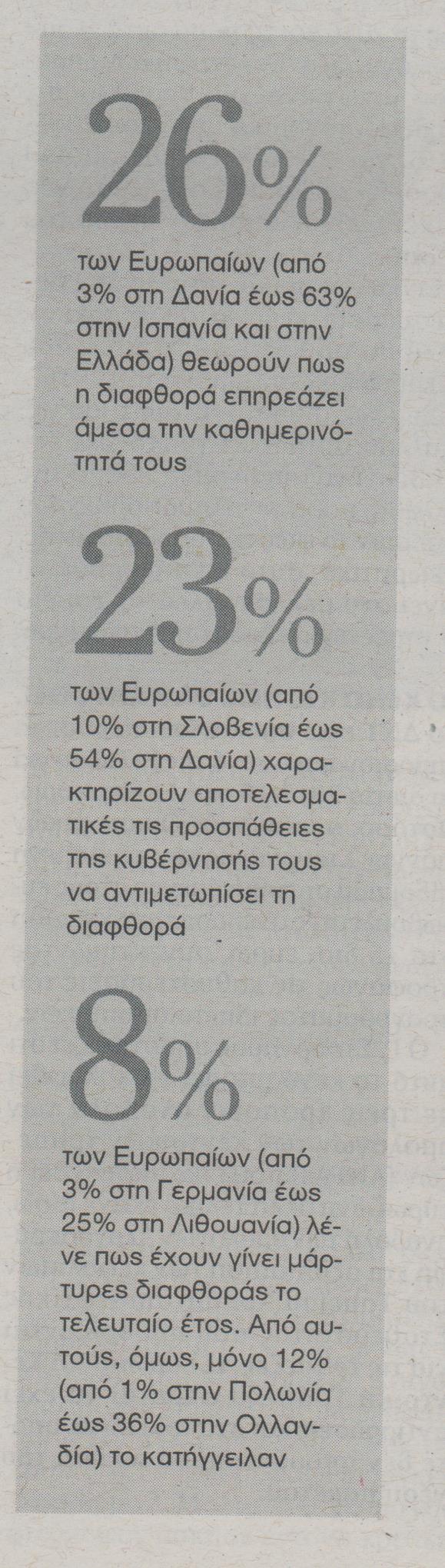 Οι λοιποί, δηλαδή το 99% του ελληνικού πληθυσμού, θεωρούν ότι υπάρχει και μάλιστα εν εκτάσει. Την ίδια άποψη για τη διαφθορά στη χώρα τους έχει μόλις το 20% των Δανών, ενώ κατά το μέσο όρο στην ΕΕ το αντίστοιχο ποσοστό ανέρχεται στο διόλου ευκαταφρόνητο 76%.