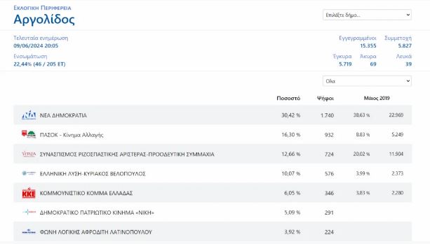 Από τα μέχρι στιγμής εκλογικά αποτελέσματα στην Αργολίδα, που προκύπτουν από την επίσημη καταμέτρηση των 46 από τα 205 εκλογικά τμήματα, τα ποσοστά των πρώτων κομμάτων διαμορφώνονται, ως εξής:
