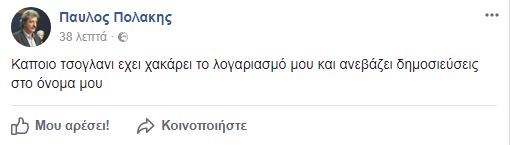 «Κάποιο τσογλάνι έχει χακάρει το λογαριασμό μου και ανεβάζει δημοσιεύσεις στο όνομα μου», έγραψε χαρακτηριστικά.