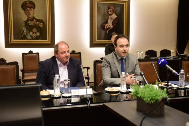 «Αγαπητέ κύριε συνάδελφε, κύριε Υπουργέ, κύριε Γενικέ, ευχαριστούμε πάρα πολύ για την επίσκεψη σήμερα στο Υπουργείο Εθνικής Άμυνας. Αυτό το οποίο είναι αξιοσημείωτο, και οφείλεται και στις δικές σας μεγάλες προσπάθειες, είναι η σύσφιγξη των δεσμών του Υπουργείου Εθνικής Άμυνας, δηλαδή στην πραγματικότητα των Ενόπλων Δυνάμεων της Πατρίδας μας, με το Υπουργείο Ψηφιακής Διακυβέρνησης. Το ότι προέκυψε αυτή η ανάγκη, ότι καλύπτεται αυτή η ανάγκη υπό τη στενή μας συνεργασία, δείχνει ακριβώς πώς οι Ένοπλες Δυνάμεις, όλη η χώρα – αλλά εγώ μιλάω εξ ονόματος των Ενόπλων Δυνάμεων μαζί με τον Αρχηγό ΓΕΕΘΑ που είναι στα αριστερά μου – περνάμε σε μια νέα εποχή στην οποία οι νέες ψηφιακές τεχνολογίες είναι απαραίτητο στοιχείο για να μπορέσουμε να υλοποιήσουμε το δόγμα της αποτροπής. Έχουμε πολλά να συζητήσουμε. Έχουμε να συζητήσουμε το θέμα του επικοινωνιακού δορυφόρου των Ενόπλων Δυνάμεων, το οποίο για μας είναι μια απαραίτητη προϋπόθεση για τον εκσυγχρονισμό τους, το θέμα των μικροδορυφόρων, το θέμα των εγκαταστάσεων σε ήδη υπάρχουσες δομές των Ενόπλων Δυνάμεων φορέων του δικού σας Υπουργείου. Που κι αυτό οδηγεί σε μια περαιτέρω σύσφιγξη των σχέσεων, τη συμμετοχή σε κοινές ασκήσεις στο εξωτερικό, διπλής χρήσης, και είναι εξαιρετικά σημαντικό. Θα ήθελα λοιπόν να σας ευχαριστήσω και πάλι θερμά για την εδώ παρουσία σας, για τη συνεργασία, στην οποία προσβλέπω. Προσβλέπω, δηλαδή, όταν φύγουμε – διότι όλοι φεύγουμε μια ημέρα – να αφήσουμε πίσω μας μια άλλη πραγματικότητα, μια άλλη ψηφιακή πραγματικότητα και στις Ένοπλες Δυνάμεις και στη χώρα. Ευχαριστώ και πάλι θερμά».