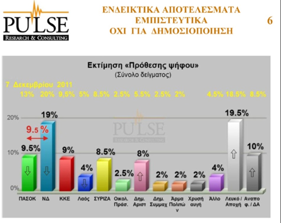 Φώτιές άναψε στο ΠΑ.ΣΟ.Κ η δημοσκόπηση που έγινε για την εφημερίδα “Το Πντίκι” και δείχνει το κόμμα στο 9,5%. ‘Ολα αυτά λίγες ώρες πριν την καθοριστική συνεδρίαση της κοινοβουλευτικής ομάδας όπου θα ξεκαθαρίσει το τοπίο των συσχετισμών δυνάμεων εντός του κόμματος. Μετά τις εξελίξεις αναμένεται με ιδαίτερο ενδιαφέρον η στάση που θα τηρήσουν οι Βενιζέλος και Λοβέρδος. ΔΕΙΤΕ ΤΗΝ ΔΗΜΟΣΚΟΠΗΣΗ Μονοψήφιο ποσοστό στην πρόθεση ψήφου εμφανίζει για πρώτη φορά το ΠΑΣΟΚ, σύμφωνα με νέα δημοσκόπηση της εταιρείας Pulse RC που δημοσιεύει αύριο “Το Ποντίκι”. Το ποσοστό του ΠΑΣΟΚ ανέρχεται στο 9,5%, με διαφορά 9,5 μονάδες από τη ΝΔ, που επίσης εμφανίζεται με μειωμένα ποσοστά από τη προηγούμενη δημοσκόπηση της ίδιας εταιρείας το Δεκέμβριο (-1%).