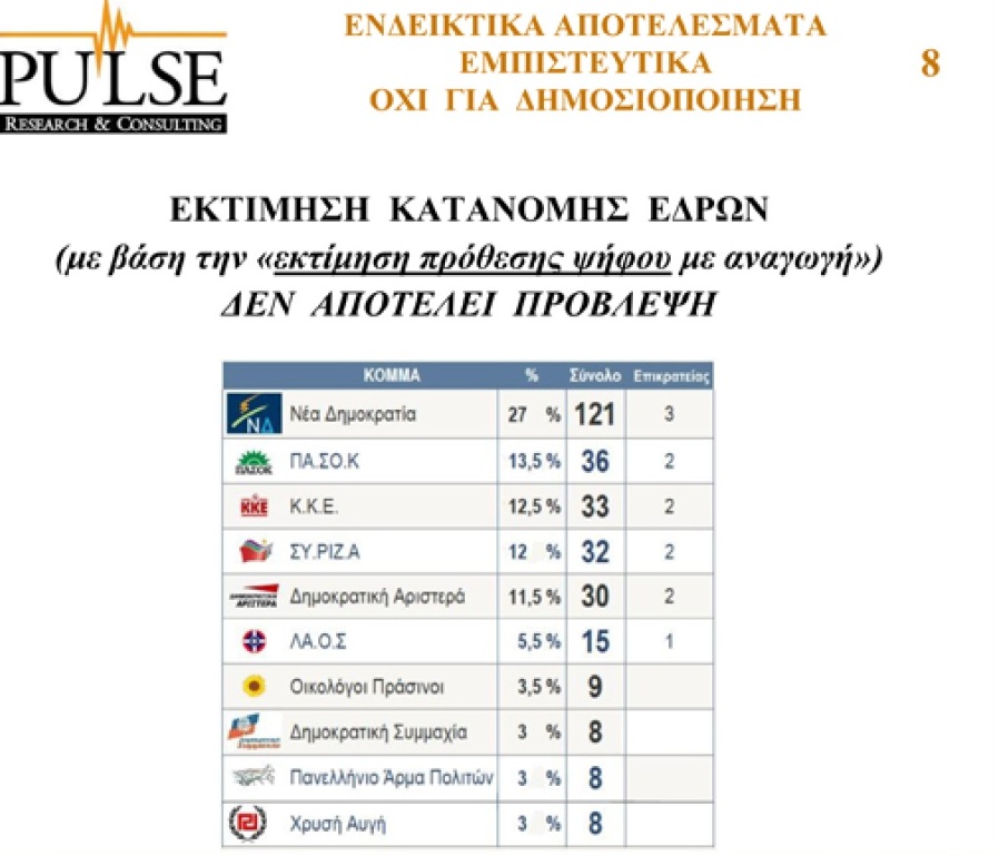 Με βάση τα δημοσκοπικά δεδομένα της έρευνας της Pulse RC τρεις στους τέσσερις βουλευτές του ΠΑΣΟΚ μένουν εκτός βουλής! Ενώ, η αριστερά αθροιστικά έλκει, έναν στους τρεις ψηφοφόρους.Όλες οι λεπτομέρειες της δημοσκόπησης στο Ποντίκι.
