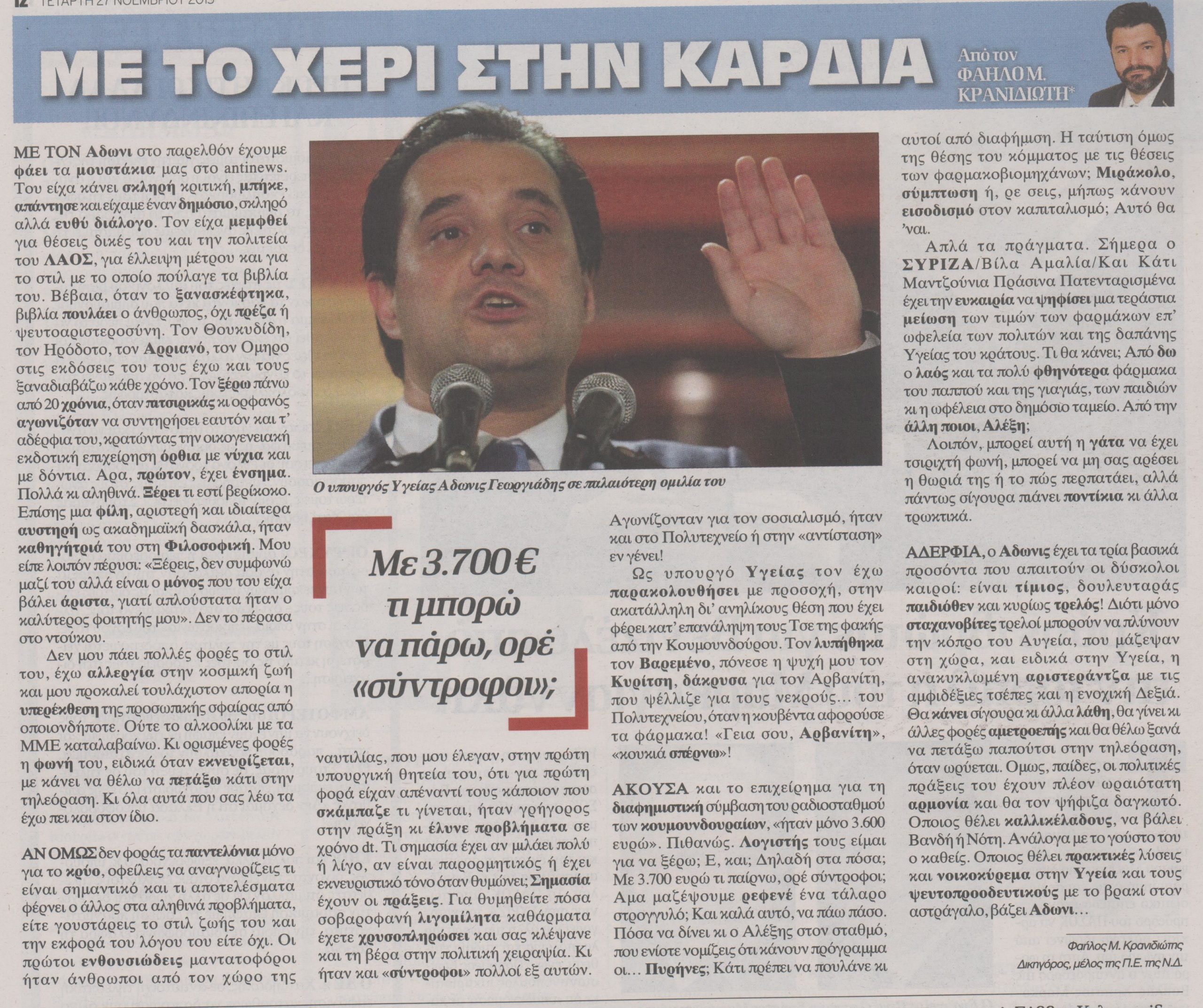 «Με τον Αδωνι στο παρελθόν έχουμε φάει τα μουστάκια μας στο antinews. Του είχα κάνει σκληρή κριτική, μπήκε, απάντησε και είχαμε έναν δημόσιο, σκληρό αλλά ευθύ διάλογο. Τον είχα μεμφθεί για θέσεις δικές του και την πολιτεία του ΛΑΟΣ, για έλλειψη μέτρου και για το στιλ με το οποίο πούλαγε τα βιβλία του. Βέβαια, όταν το ξανασκέφτηκα, βιβλία πουλάει ο άνθρωπος, όχι πρέζα ή ψευτοαριστεροσύνη. Τον Θουκυδίδη, τον Ηρόδοτο, τον Αρριανό, τον Ομηρο στις εκδόσεις του τους έχω και τους ξαναδιαβάζω κάθε χρόνο.