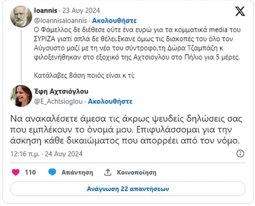 Στην ανάρτηση αντέδρασε και η Έφη Αχτσιόγλου, το όνομα της οποίας επίσης αναφέρθηκε, κάνοντας λόγο για ψευδείς δηλώσεις.