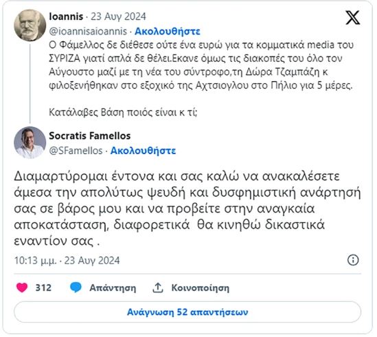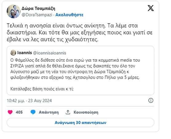 Στη Δικαιοσύνη αναμένεται να προσφύγουν ο Σωκράτης Φάμελλος και η Δώρα Τσαμπάτζη μετά την ανάρτηση σε ανώνυμο λογαριασμό στα social media. Σύμφωνα με αυτή ο Σωκράτης Φάμελλος «δεν διέθεσε χρήματα για τα ΜΜΕ του ΣΥΡΙΖΑ» και «έκανε διακοπές όλο τον Αύγουστο μαζί με τη νέα του σύντροφο, τη Δώρα Τσαμπάζη, φιλοξενούμενοι στο εξοχικό της Αχτσιόγλου στο Πήλιο για 5 μέρες».