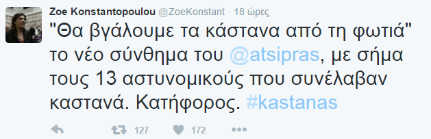 Η πρώην βουλευτής του ΣΥΡΙΖΑ, έγραψε στο Twitter: «Θα βγάλουμε τα κάστανα από τη φωτιά” το νέο σύνθημα του @atsipras, με σήμα τους 13 αστυνομικούς που συνέλαβαν καστανά. Κατήφορος. #kastanas»