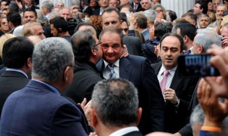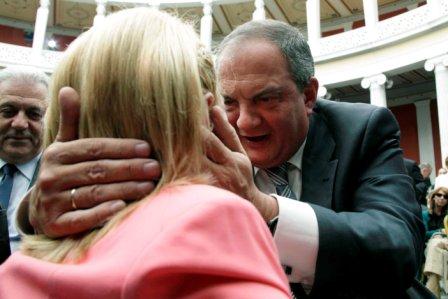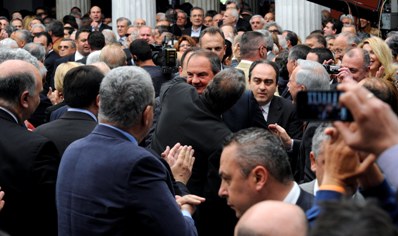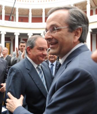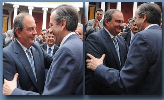 Ευδιάθετος και χαμογελαστός, ο πρώην πρωθυπουργός, χειροκρότησε όρθιος τον Αντώνη Σαμαρά κατά την είσοδό του στο Ζάππειο Μέγαρο, στεκόμενος πλάι στον Δημήτρη Αβραμόπουλο, ενώ κάθισε δίπλα στη σύζυγο του προέδρου της Νέας Δημοκρατίας, Γεωργία.Στο τέλος της ομιλίας του ο Αντώνης Σαμαράς πήγε κοντά στον πρώην πρόεδρο της Νέας Δημοκρατίας και τον αγκάλιασε υπό τις επευφημίες και τα χειροκροτήματα των παρευρισκομένων.ΔΕΙΤΕ ΤΟ ΒΙΝΤΕΟ: