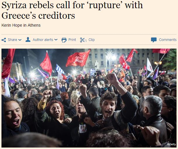 Στην ανταρσία της σκληρής αριστερής πτέρυγας του ΣΥΡΙΖΑ αφιερώνει κεντρικό άρθρο για την Ελλάδα η εφημερίδα Financial Times, οι οποίοι καλούν δημόσια σε «ρήξη» με τους πιστωτές, την ώρα που ο πρωθυπουργός Αλέξης Τσίπρας κινείται πιο κοντά σε μια νέα συμφωνία διάσωσης.