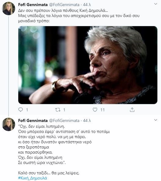 Με ανάρτηση στον προσωπικό της λογαριασμό στο twitter αποχαιρετά η πρόεδρος του Κινήματος Αλλαγής, Φώφη Γεννηματά την σπουδαία ποιήτρια Κική Δημουλά.