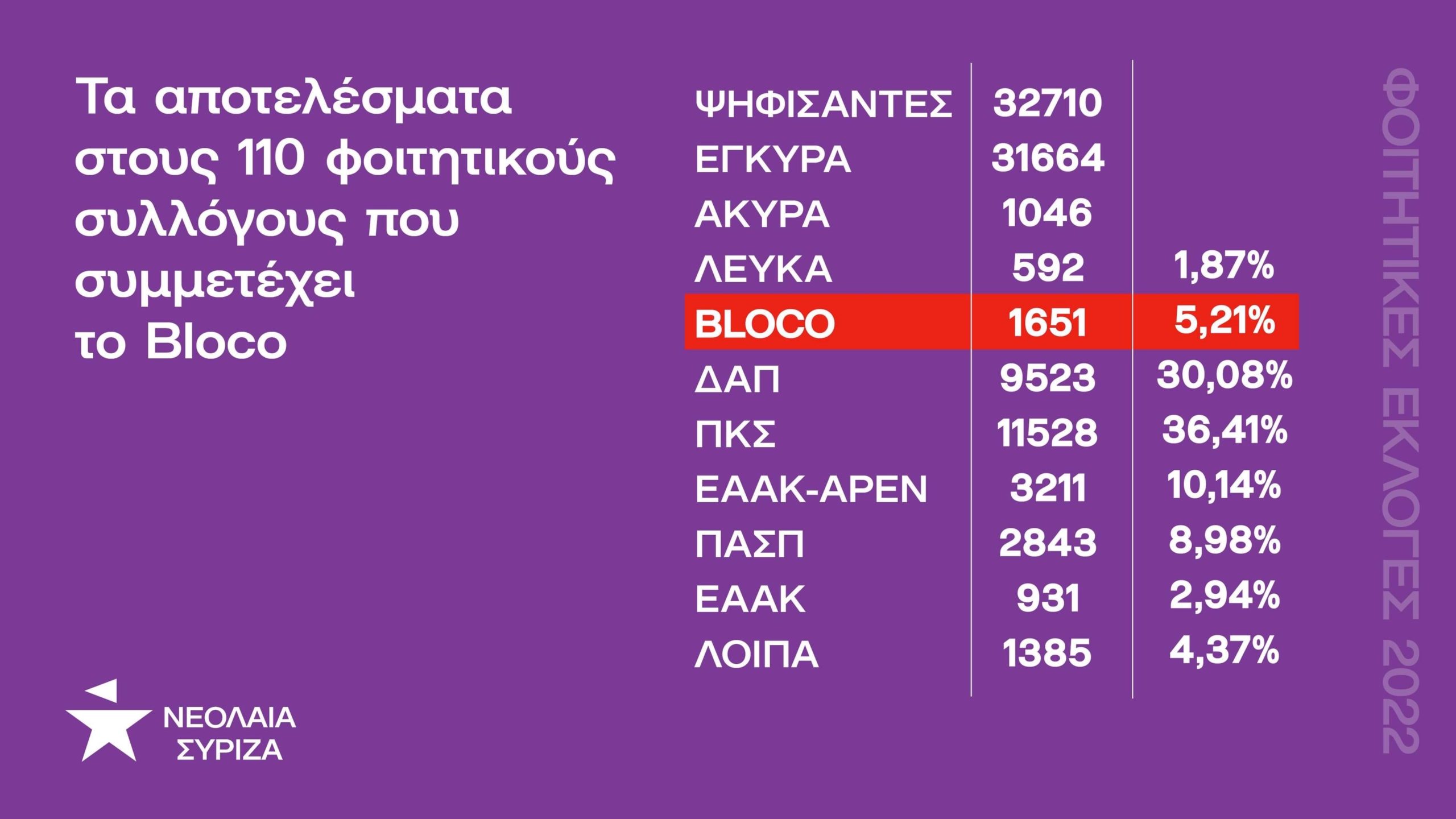 Το Bloco Ριζοσπαστικής Αριστεράς, μέσα από το οποίο παρεμβαίνουν οι δυνάμεις της Νεολαίας ΣΥΡΙΖΑ στα ΑΕΙ, κατάφερε να διπλασιάσει την καταγραφή του και να τετραπλασιάσει τις έδρες του στα Διοικητικά Συμβούλια των φοιτητικών συλλόγων, μετά από μια περίοδο, μάλιστα, με πρωτόγνωρες συνθήκες λόγω των lockdown και των κλειστών πανεπιστημίων.