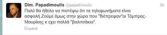 «Πολύ θα ήθελα να πιστέψω ότι τα τηλεφωνήματα είναι ασφαλή. Ζούμε όμως στην χώρα που “διέπρεψαν”οι Τόμπρας-Μαυρίκης κ εχει πολλά “βαλιτσάκια”.» ήταν το tweet του Δημήτρη Παπαδημούλη. Ενα μήνυμα που λίγη ώρα αργότερα αναπαρήγαγε στον προσωπικό του λογαριασμό στο twitter, ο διευθυντής του πολιτικού γραφείου του προέδρου του ΣΥΡΙΖΑ, Νίκος Παππάς.