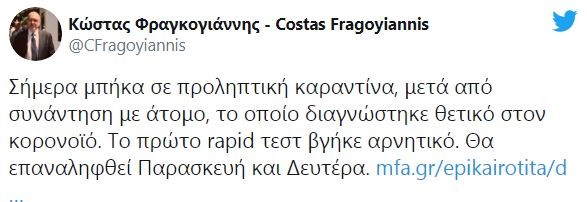 Με ανάρτησή του στο twitter, o Κώστας Φραγκογιάννης έκανε γνωστό ότι το πρώτο rapid τεστ, στο οποίο υποβλήθηκε, βγήκε αρνητικό.