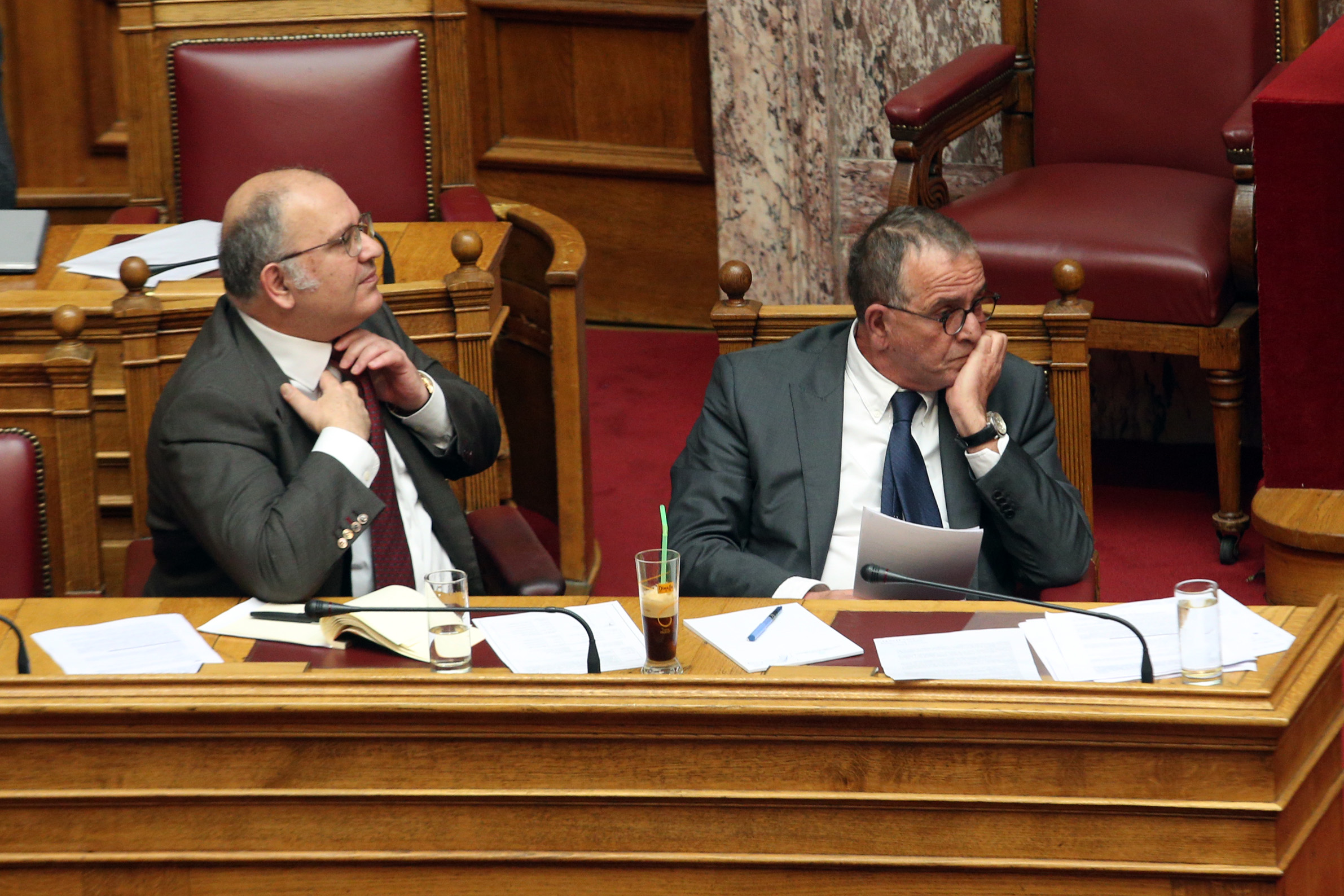 Τα φλας των φωτογράφων τράβηξε ένα ποτήρι καφέ, πιθανότατα φραπέ, στα υπουργικά έδρανα της βουλής.