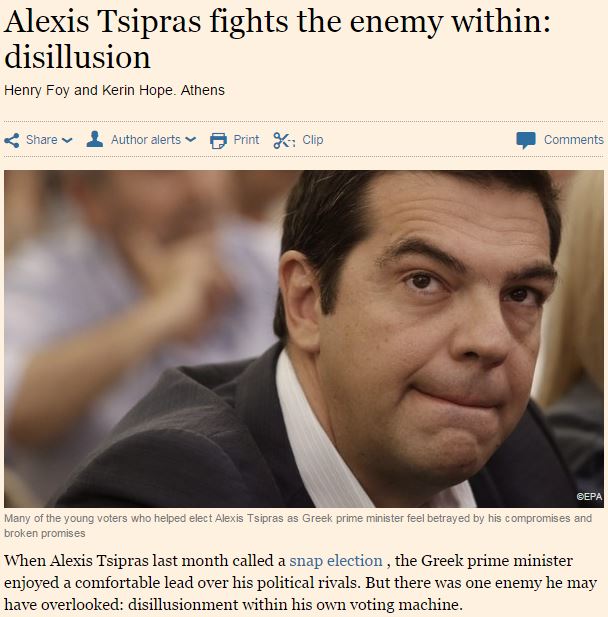 Πολλοί από τους νεαρούς ψηφοφόρους που οδήγησαν τον ΣΥΡΙΖΑ στην κυβέρνηση πριν από εννιά μήνες νιώθουν επίσης προδομένοι από τους συμβιβασμούς του κ. Τσίπρα και την αθέτηση των υποσχέσεων. Ο πρωθυπουργός ήρθε στην εξουσία ως ένας εμπρηστικός μαχητής κατά της λιτότητας αλλά την παραδίδει ως ένας καθυποταγμένος πραγματιστής.