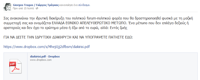 Μάλιστα, επισυνάπτει και την ιδρυτική διακήρυξη του “κόμματος”. Για να διαβάσετε τη διακήρυξη πατήστε εδώ. “Εφόσον αποδέχεστε την ιδρυτική διακήρυξη του κόμματος «ΕΛΛΑΔΑ ΕΘΝΙΚΟ ΑΠΕΛΕΥΘΕΡΩΤΙΚΟ ΜΕΤΩΠΟ»”, αναφέρει ο κ. Τράγκας στη σελίδα του, “θα πρέπει να συμπληρώσετε τα στοιχεία σας στους σχετικούς πίνακες”.