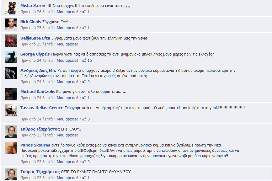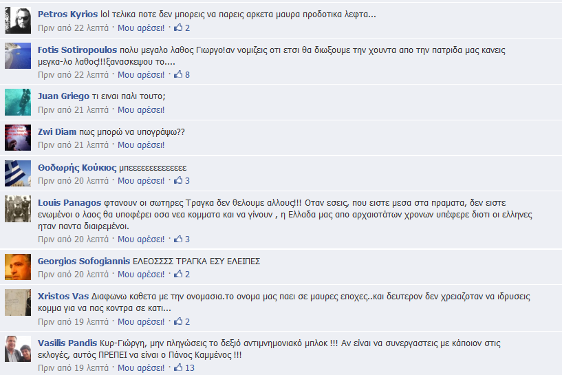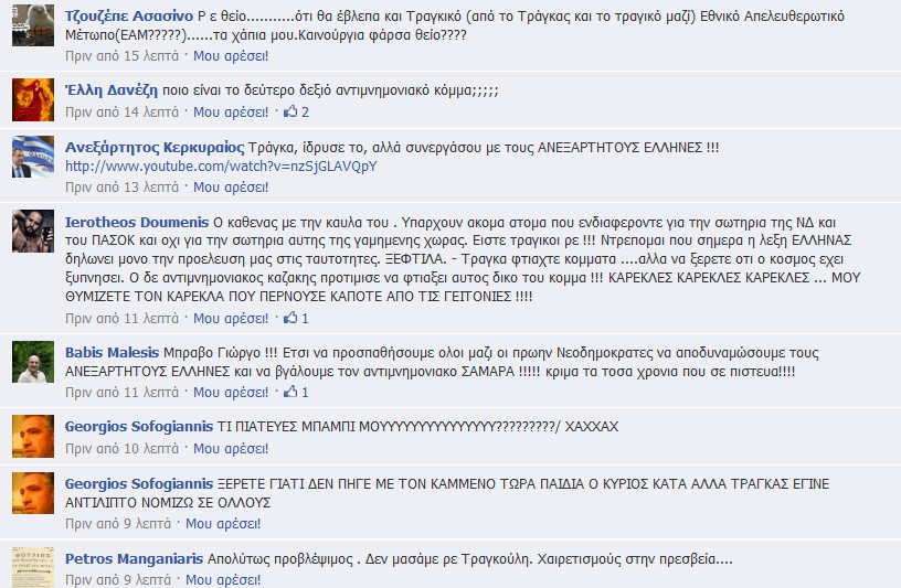 Τηλέφωνα επικοινωνίας 210-2821535 Μετά την ανακοίνωση της ίδρυσης του πολιτικού φορέα, όπως ήταν φυσικό η σελίδα του Γιώργου Τράγκα στο Facebook βομβαρδίστηκε κυριολεκτικά με σχόλια.