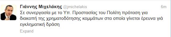 “Σε συνεργασία με το Υπ. Προστασίας του Πολίτη πρόταση για διακοπή της χρηματοδότησης κομμάτων στα οποία γίνεται έρευνα γιά εγκληματική δράση”, αναφέρει ο υπουργός Εσωτερικών Γιάννης Μιχελάκης στο Twitter.